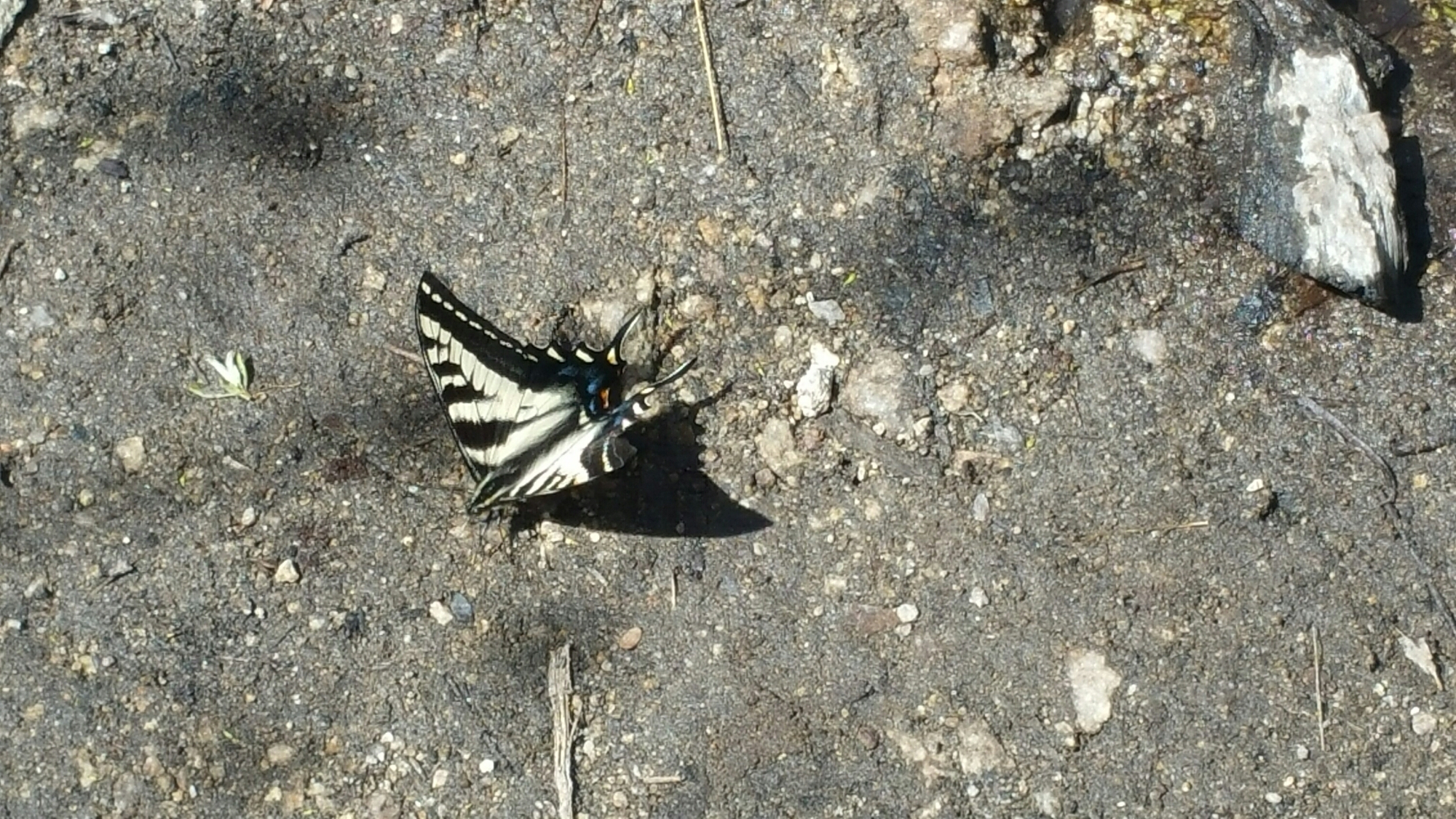 As the day wore on and approached 12:00, I started to feel the effects of climbing uphill in the heat, when suddenly there appeared a lovely little spot under some pine trees, overlooking the vast expanse of mountains to the North and East, and I just had to stop and sit there leaning against that tree for a bit. I feverishly ate that orange and it was the most perfect juicy, sweet and sour fruit which melted my discomfort away immediately. I then migrated over to a rock which was perched in the sun and just flat enough to sit cross legged on, and began to meditate. I am trying to meditate every day, but often it does not happen because I am too “busy” trying to make miles or to “tired” to do anything but eat and sleep and set up camp at the end of the day. So, I have found that a mid-day meditation works very well. In this case it was a perfect environment, not too hot or cold or windy or anything, just comfortable. Well, I came out of this meditation about 30 minutes later and got back on the trail in a completely different head space than I had been in before. It was great. I was not thinking about mileage, or where I was going, what was next, just “be-ing” everything that was around me. I often find that in meditation I loose my sense of physical self, or being attached to that, and I am able to stretch myself, my consciousness all the way out to my surrounding environment. In this case, as I had started walking again, I became everything that was in front of me. I thouoght to myself, “I AM that blade of grass”, “I AM that rock”, “I AM that water trickling” and “I AM the dirt and sand”. It was as if I was just using this body here to look out into the world through, but I was not segregated by it, in fact I was just a part of everything. This is what I love about meditating in the wilderness. It allows me to merge so much more with my surroundings- with just some simple breathwork I have triggered another part of my brain to come alive. I continued along at quite a slow pace and let go completely of any attachment to miles for the time being. Soon, I came across a tiny little stream that bisected the trail, and I stopped to check out the water availability, but instead ended up standing still just watching the bees and other insects go about their business and listening to their little sounds of buzzing, the sound of the stream trickling over rocks, and the wind in the distance whipping over old burned trees. Just then, a butterfly swooped in and started flitting around me. I had hoped to see more of these great creatures, for it was a variation of Swallowtail, with a pointed wing tip at the bottom sides and striking design of yellow and black. The butterfly stopped on the ground in front of me long enough to take a picture.