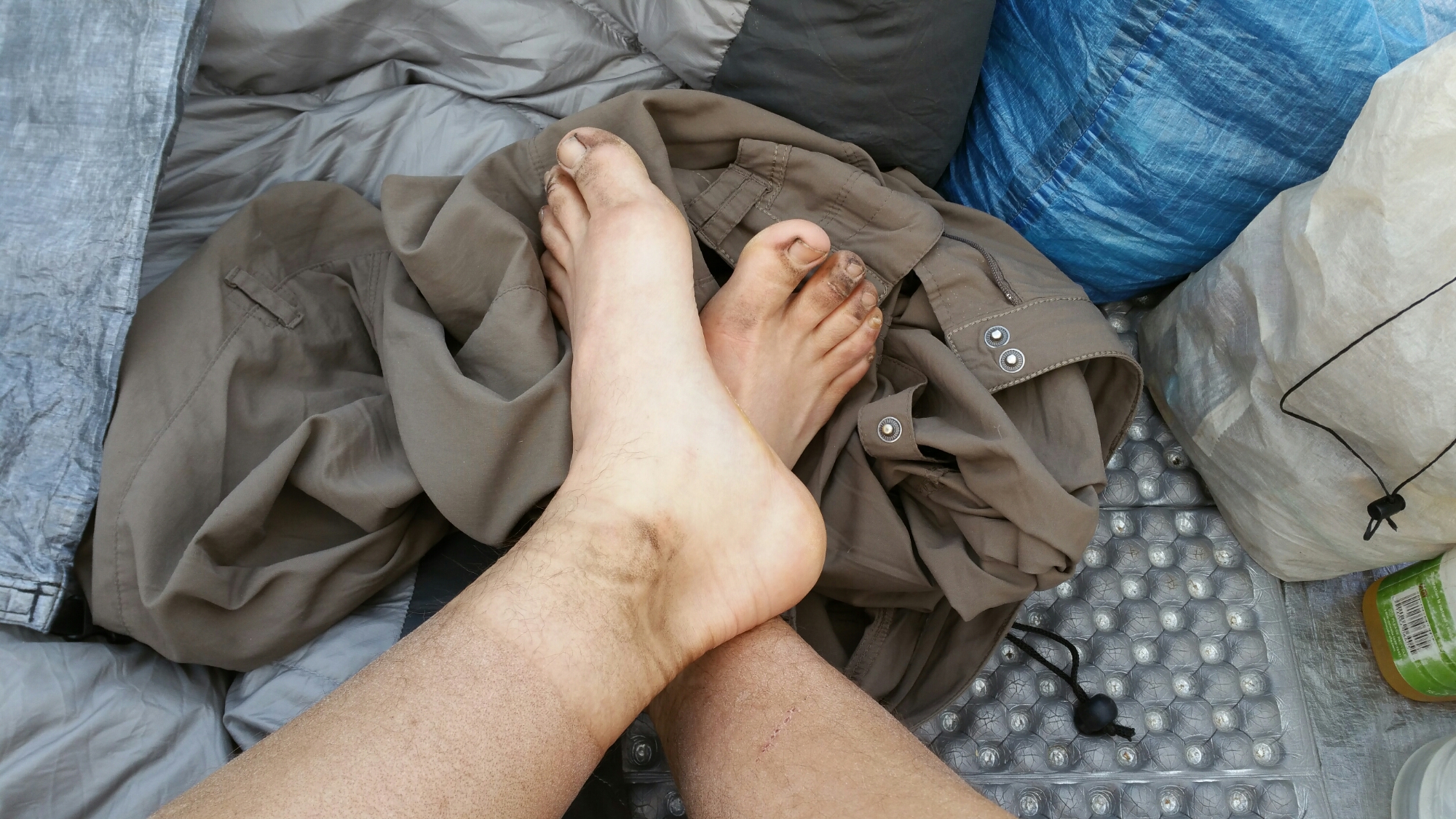 So, I had to go back by the guy who was sleeping in the trail and I apologized as I crept back by his nest. I continued back UP that dark creepy ravine with the plethora of poodle dog bush lining the trail, for about 30 minutes back to where the little dirt road intersection was. It was SO much further going back up there than coming down, of course! I finally reached the spot by about 9:30pm, and my upper back, neck and shoulders burned like crazy and I could not get them to stop even after taking off my pack. I have grown accustomed to pitching my tent in the dark, and cooking and eating my dinner the same way. It really doesn’t bother me. So I continued with my usual routine, skipping the “towel bath” and putting on my sleep clothes in the filthy state I was in, unfortunately, but all I was going to do in the morning was just get up and get dirty all over again.