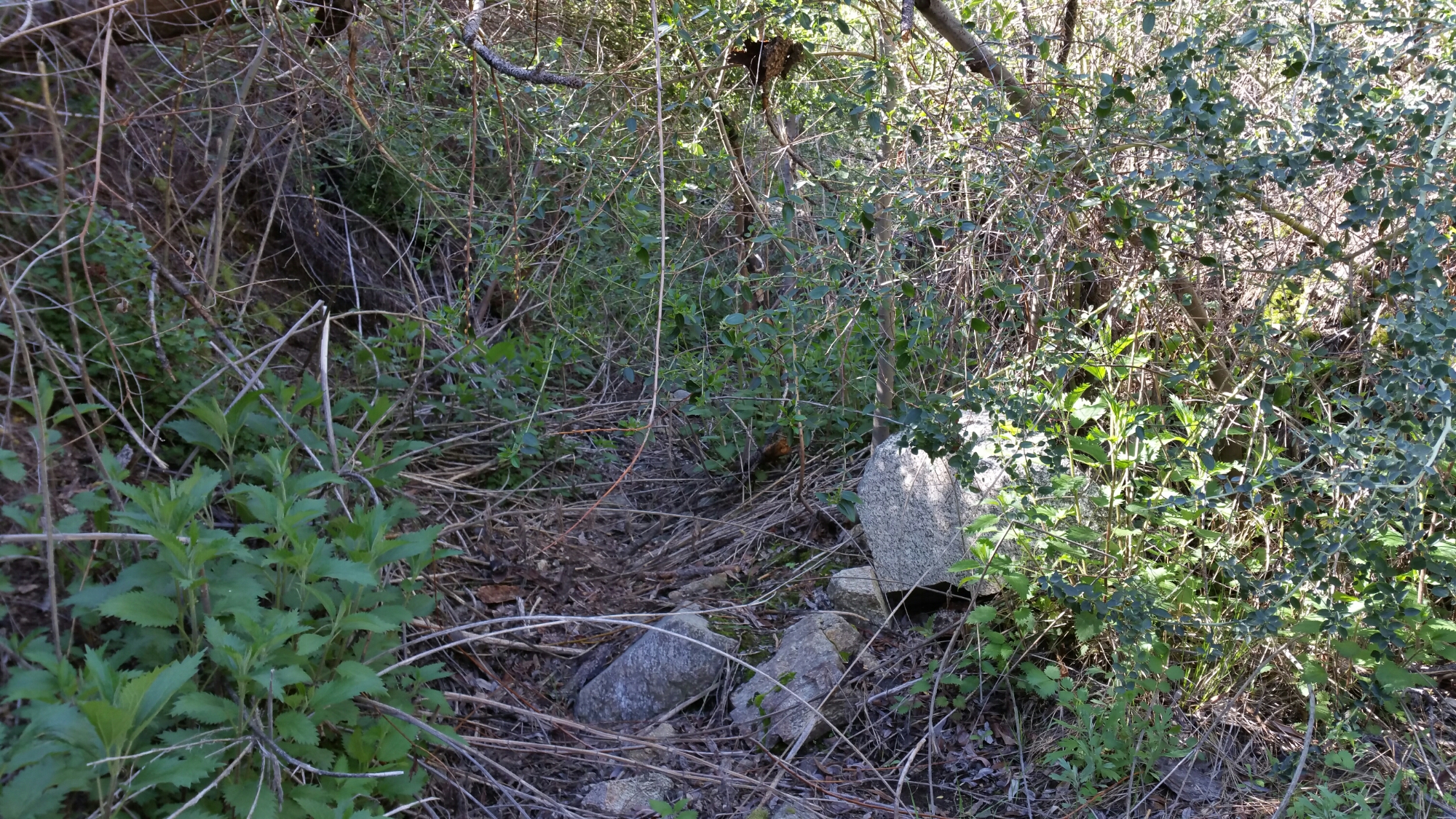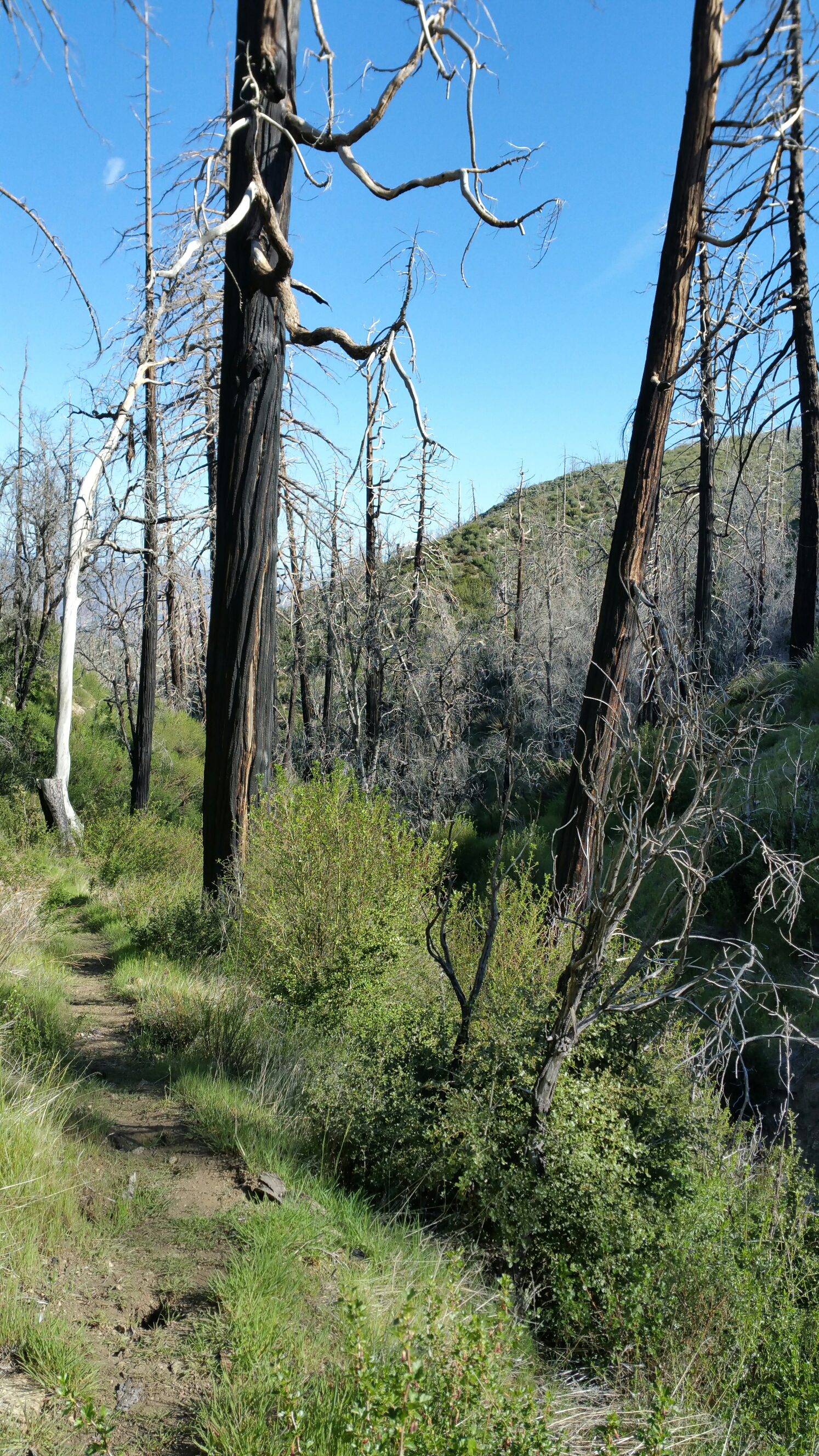 By this time it was about 7:45 and I headed into the night. I would have loved to night hike with only the light of the Full Moon, had it not been the the nasty bush that I had to watch out for. It is just like poison oak if you touch it, it can get your hospitalized. So, I kept my headlamp on and dodged the nasty stuff (hopefully) as much as I could. The trail meandered around the edges of a slope with a giant slope that dropped off to my right, full of burned old dead trees. In the darkness, everything looked a lot creepier. There was a ravine forming after I crossed a small dirt road intersection (where I should have stopped but didn’t), and as I traversed lower along the trail, that ravine got deeper and thus darker, soon looking like a giant abyss. Even if I shined my headlight into it, it was deep and black. I fortunately have the HalfMile phone App, which tells you your exact mile location, and I gratefully used it to help my find mile 426.0. Thankfull too that I had charged my phone earlier, otherwise this would have been impossible. Well, just before mile 426, I saw up ahead a reflective something of some kind, and as I approached more closely, discovered that another hiker had pitched his tent right there in the middle of the trail. It was about 8:30pm or so, and I tried to tiptoe around him, but suddenly a voice came from inside the tent, apologizing for being in the middle of the trail. “No worries” I called out, “you’re fine”, and I continued along, as I was determined at that point to make it to the exact mile 426 to find out if that flat camp spot was going to be there. Believe me, at this point I had my doubts and I had already resolved that I would continue up to a half mile after the spot and if there was no place to camp I would have to back track over a mile to that road I had crossed a while back. So, what do you think I did? Yes, I back tracked, because this is what mile 426 looked like (the next day in the daylight):