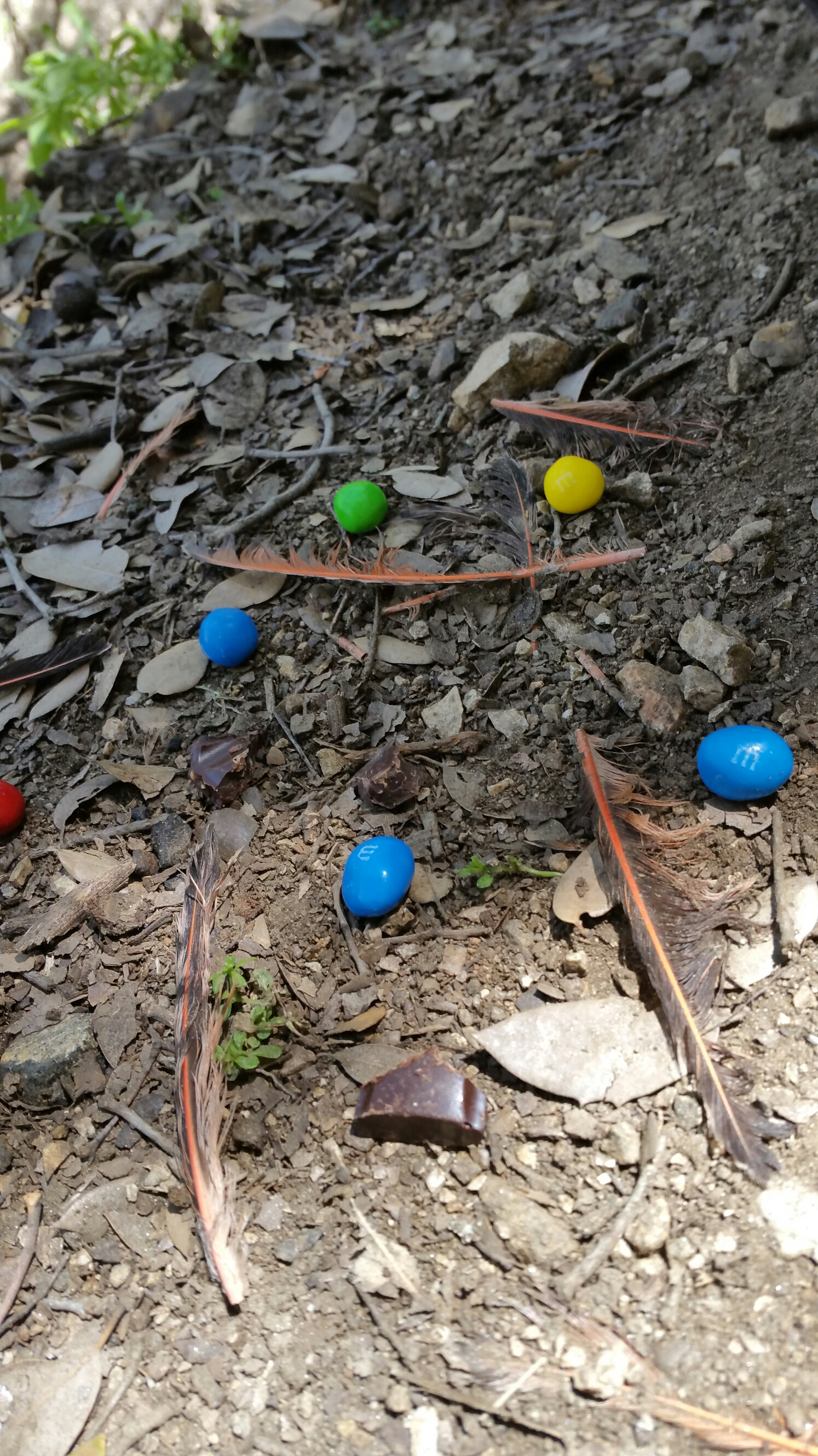 We found a swatch of Red Tail Hawk feathers right on the trail, and we left an offering of M & M’s and chocolate in exchange for a feather…