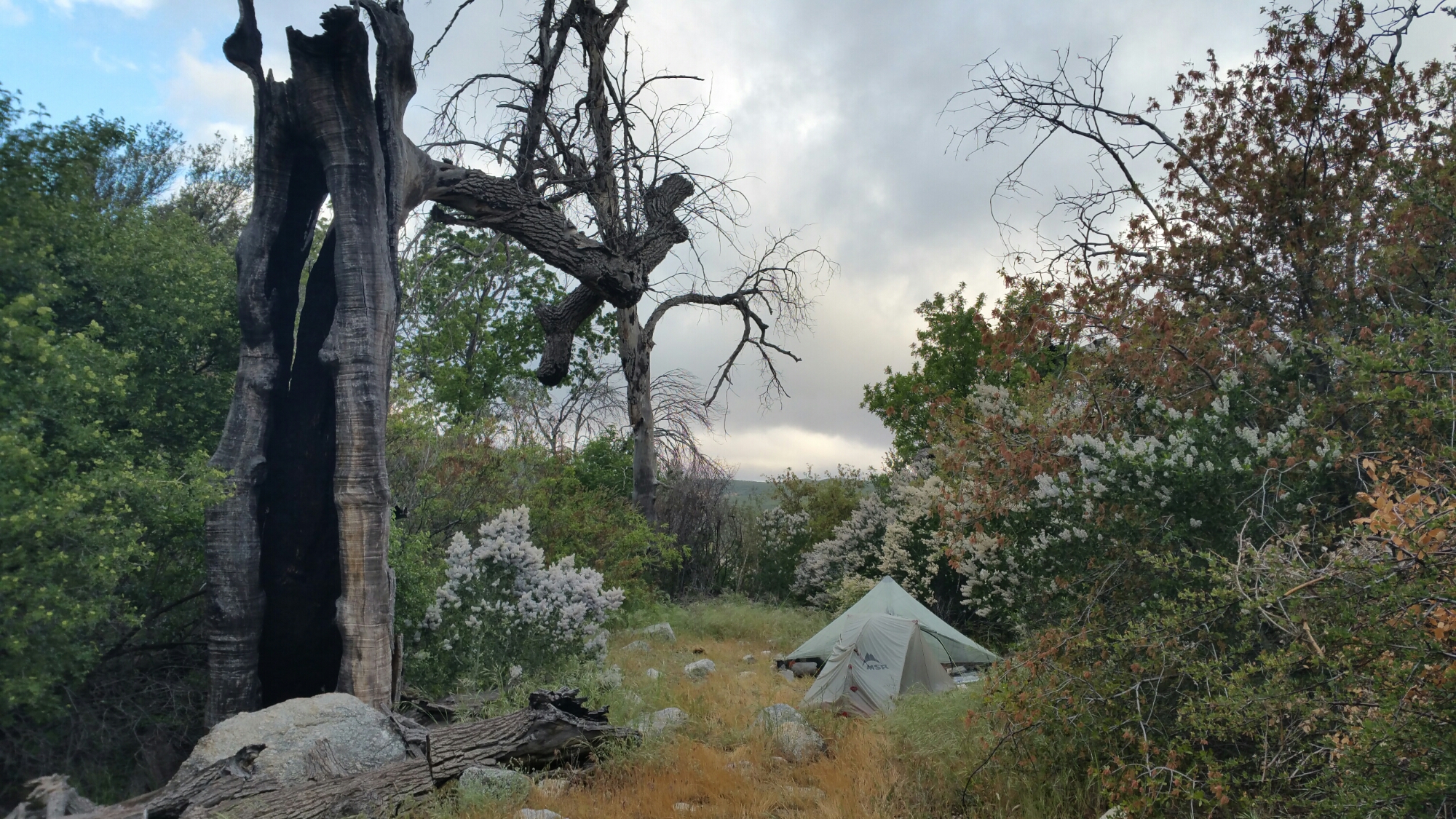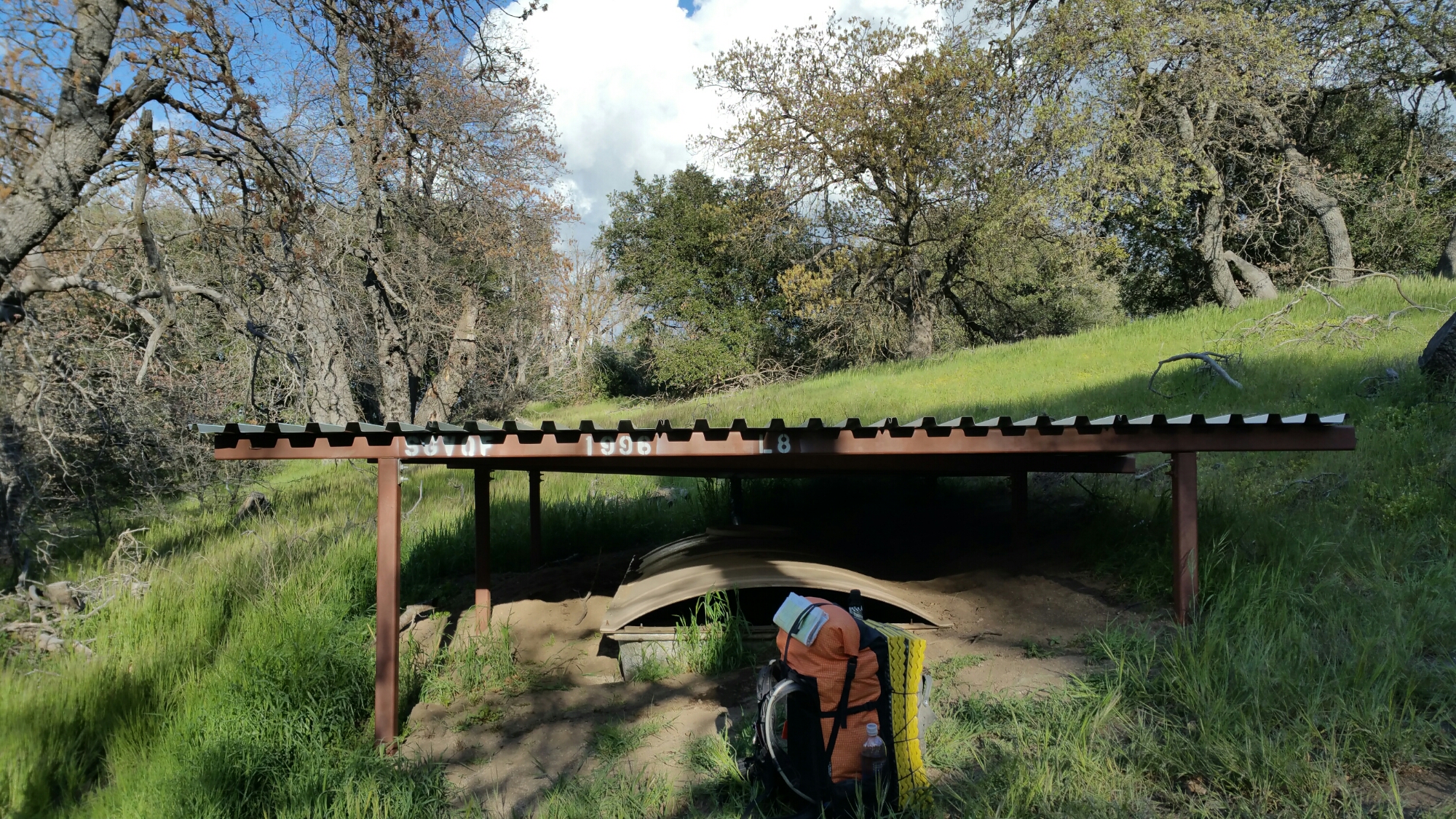 We collected water from a “guzzler”, which I never knew what a guzzler was until yesterday. It is a structure that is designed to collect rain water and hold it. I would presume it would serve the purpose of helping put out a fire, but it also serves the purpose of providing fresh, clean water for thirsty hikers. It looked sketchy and funky at first glance, but then I climbed under the aluminum roof that stood about 3 feet tall, and in the back was a circular lid that you could lift off just enough to dip your bottle of water in and fill it up. It was dark reaching in there, and I had read reports of hikers finding dead rodents in places like these, so I was hesitant at best. Sure enough, the water was pure, lovely, rain water. Delicious! (yes, I treated it anyway)…