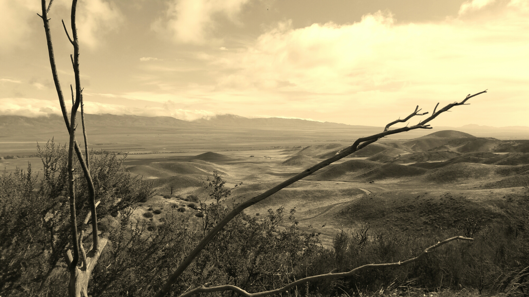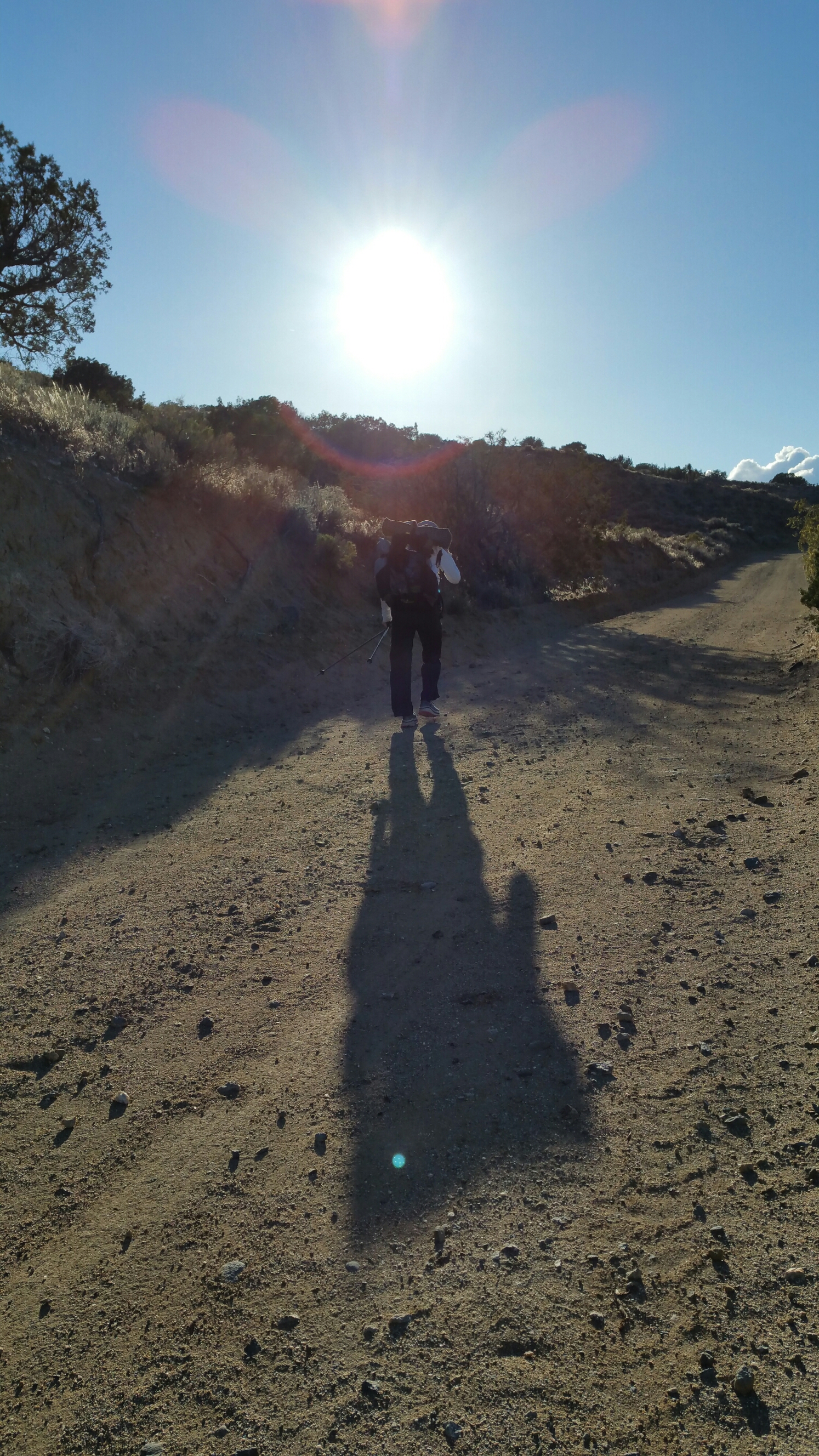 Continuing ahead, we neared closer to our goal of mile 534.9 where we knew there would be a place to camp and water, and making it a total of 24 miles for the day. The hike today was a series of long, flat, straight lines through the windy dessert, as the clouds blew in front of the sun and away again, casting alternating shadows on us all day. It was such great light, fading in and out, in and out. This was a view on the way down the hill this morning, into the flatlands.