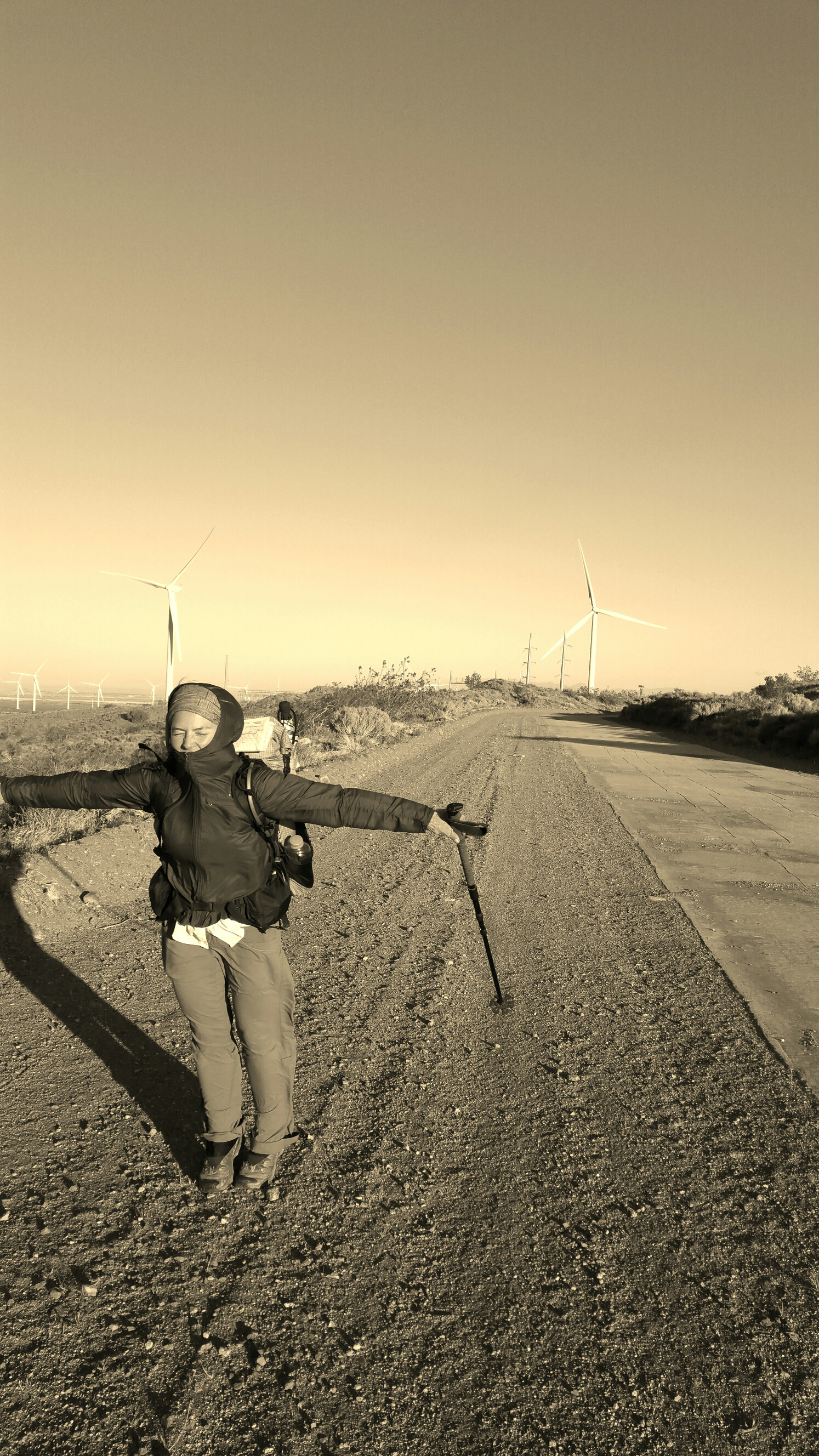 At a certain point later in the afternoon, the wind had picked up considerably, and we were getting closer and closer to the giant turbines. I started closing my eyes to keep sand from blowing in, and as my body was hurting, I began to take long deep meditative breaths. Immediately I could feel the effects of the breathing calming my nerves, and settling the pain receptors. I was squinting into the sun, and facing right into the wind. I went into a trance-like state whereby my body kept a steady pace and I suddenly no longer felt the pain. I was breathing into my pain, opening up the channels of energy all over my body, and at the same time, feeling like I was in a dream. It was actually dream-like, walking head-strong into the 30 mph wind, facing right into the sun, walking with eyes closed or just barely open, head down, steady rhythmic foot steps and bereathing in, breathing out, as the wind turbines cycled round and round and round, like a heart beat…