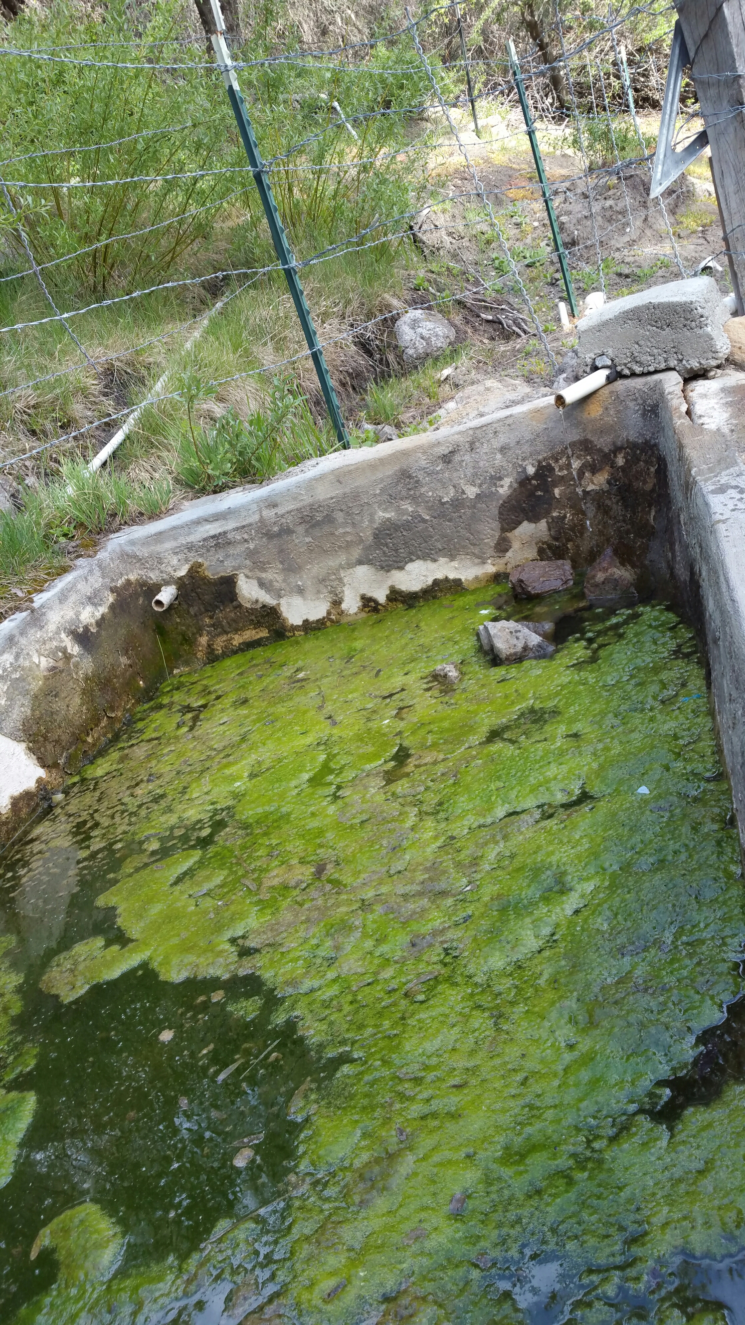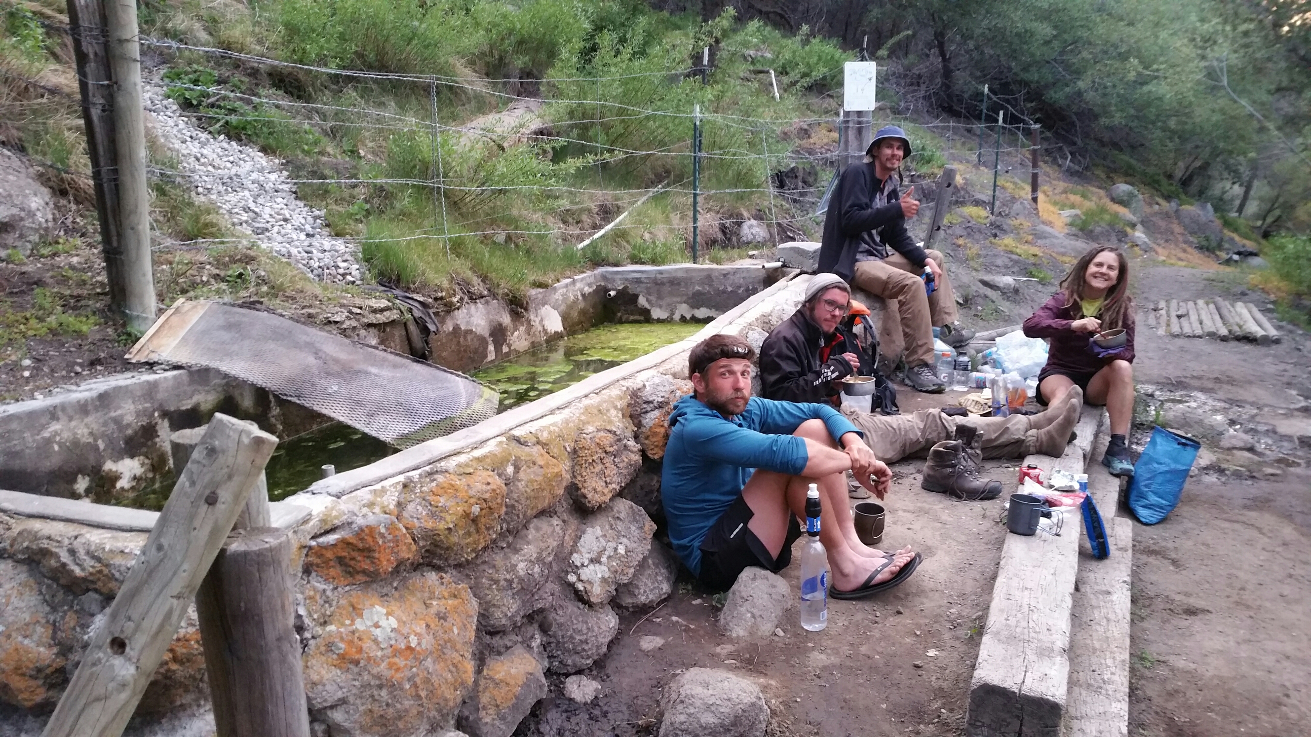 The trail climbed and climbed through different microclimates, starting in the stark barren dessert, through burned areas, more wind farms and finally finishing in the shade of Oak and Pine. By about 6:30pm we had made it to the first water source at Golden Oak Spring, where there were several other hikers. Since we had heard there could be bear in the area, we took extra precaution and cooked and ate our food down by the spring trough. It was a cement trough of algae covered water, with a black pipe sticking out, with fresh running water that was quite delicious. In the trough, in addition to the algae, were quite a few frogs who sang their chorus to us as we ate our dinners.
