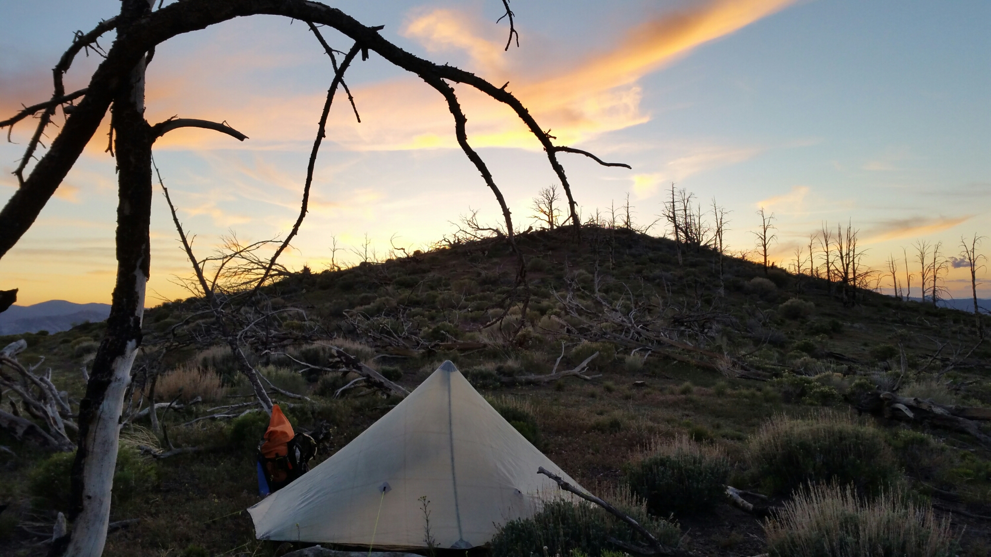 Just this morning, and that seems like so long ago, we woke up to crystal clear skies, and our first real actual view of the Sierra’s thus far on our PCT journey. If you look waaaay in the back center here, you can see the snow covered mountains: