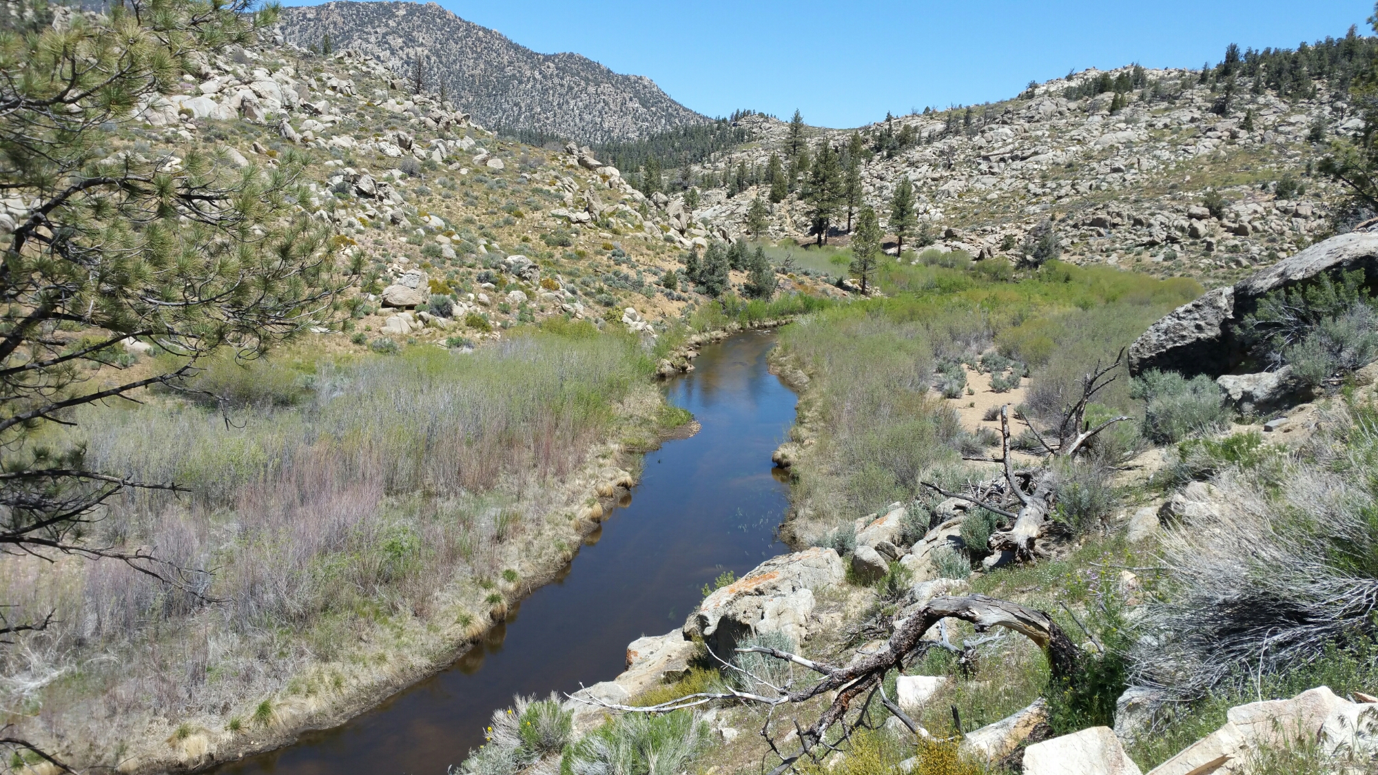 Shortly after this view, the trai descended and curved, nearly merging with the South Fork of the Kern River, and wow was I happy to have access to that water! Yesterday and today were such hot days, so much so that yesterday I had to stop and sleep in the middle of the day, and today I had to plunk my feet with shoes and socks on right into the water and also get my head wet. Not only that, but all I could think about today, as I hiked the 13 miles into Kennedy Meadows, was that cold beer I would be getting. So here I was dreaming of cold beer and dunking my feet and head into the river, knowing that in just a matter of days I will be wrapped in my down booties and pants, heating water for tea, wearing crampons and carrying my ice axe as I climb Forrester Pass, the highest pass on the entire PCT, at 13,200 something feet, very near to Mt. Whitney. The contrast is a bit mind boggling.
