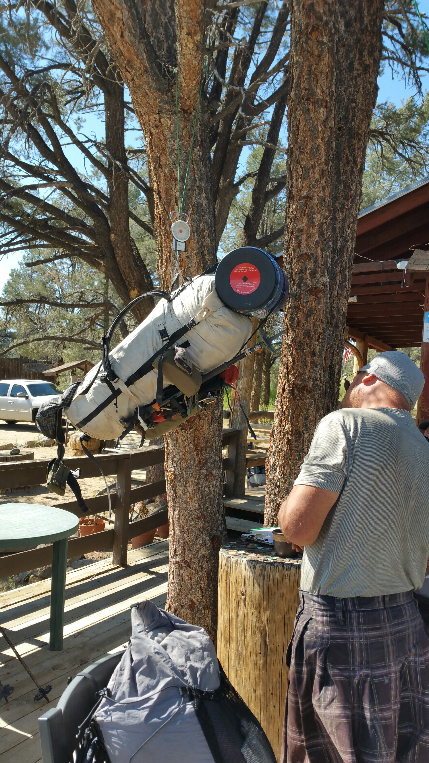 One last goodbye and I am back with my hiker group, some familiar and most are new to me. I am going to be taking a Snow Skills Course offered by Mountain Education, starting on Tuesday morning, and there are two other hikers here with me who are also taking the course: Betty “Two Bar” and “Overload”, who hikes in a Scottish Kilt, LOVE that! This is him weighing his pack with the bear canister and snow gear.