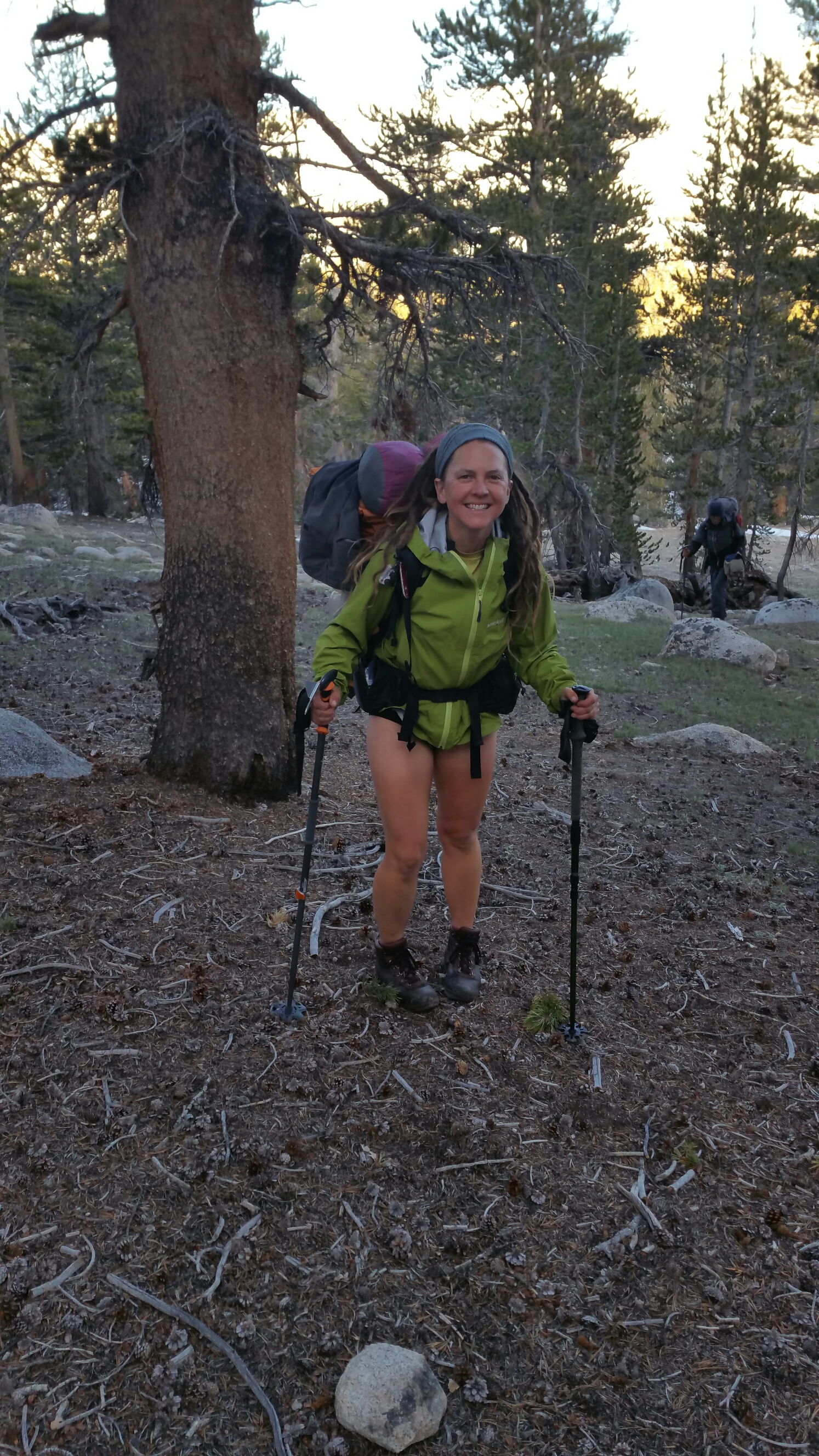 Over the course of the days we learned a lot about creek crossings. We had to cross at least a dozen, some easier and some harder, some smaller, some larger. This was by far the easiest, being that it was only about a foot deep and had a flat sandy bottom. Subsequent creek crossings would definitely challenge us and bring us out of our comfort zones enough to make us become wide awake! We crossed on top of logs, sometimes first thing in the morning, requiring a monumental abouppnt of focus at 6:00am to keep our balance. Others were powerful forces of water, whereby we searched up and down the creek for 30 minutes before settling on a safe place to cross. Ned taught us that where the trail crosses the creek is not always the safest or best place to cross. Wright Creek was the most challenging creek because of the energy in that flowing water was powerful. It was a more narrow and deeper creek, with lotsvof large boukders.When I crossed it, I learned very quickly to shuffle my feet on the bottom, because if you lift your feet up, off they go down stream, and there goes your balance real fast. Ned also taught us to lengthen our poles and place them out wide for better balance. I learned to cross the creeks in my underwear, so as not to get my pants wet. People who are six feet tall seem not to understand that people who are five feet tall can’t just roll up their pant legs and not get them wet. I was up to my thighs in that frigid water.