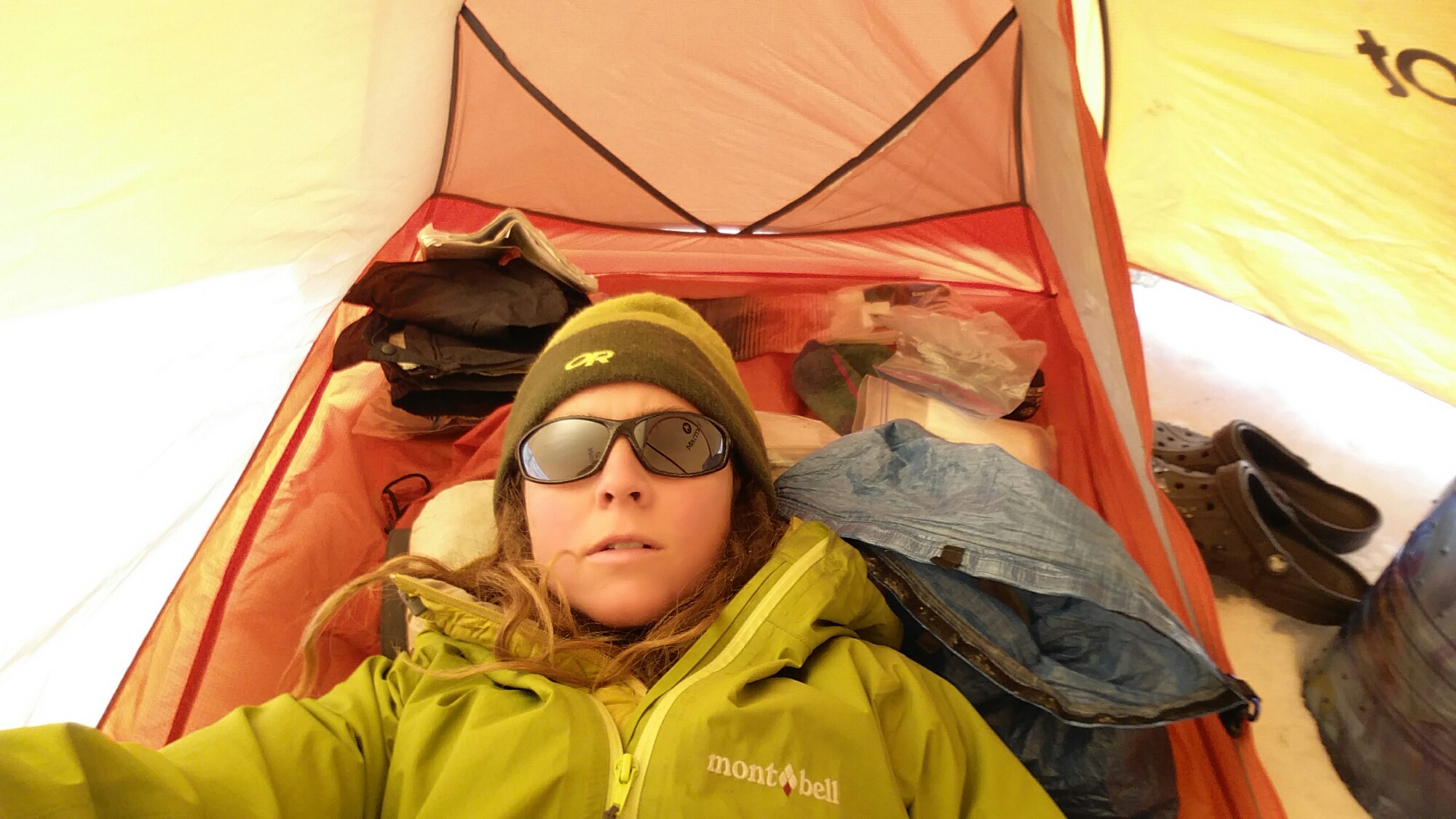 By dark, it was windy enough that I had my serious doubts about how I was going to be able to sleep at all. My tent rain fly was flapping so hard, it was like a sail on a boat out on the ocean. Fortunately, there were rocks nearby and we all collected them to help with anchoring down our tents. It was a fitful, cold, windy night. It dropped down to 19 degrees plus wind chill, and often the wind would blow so hard that it carried icicles with it, which would shower heavily on my tent, blowing in under the fly and through the mesh screen of my tent.