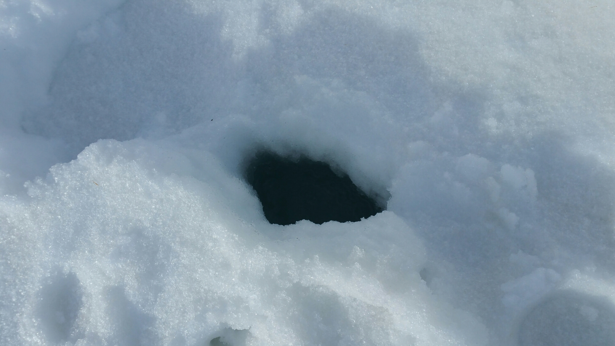 The evening got progressively colder, and windier. The had indeed wind shifted. I got out of my tent long enough to take some photos, and collect some water and then I had to get back inside for warmth and protection. The water I collected was from a frozen Lake where Ned had chopped a small hole in the ice, and I had to dip my water bottles into it to let them fill up. Three dunks of my water bottle and my hands were absolutely frozen, painful, and worsened by the wind. It was all I could do to get my cold wet hands back into my jacket pockets to warm up and regain circulation. This is the ice hole where we got water :