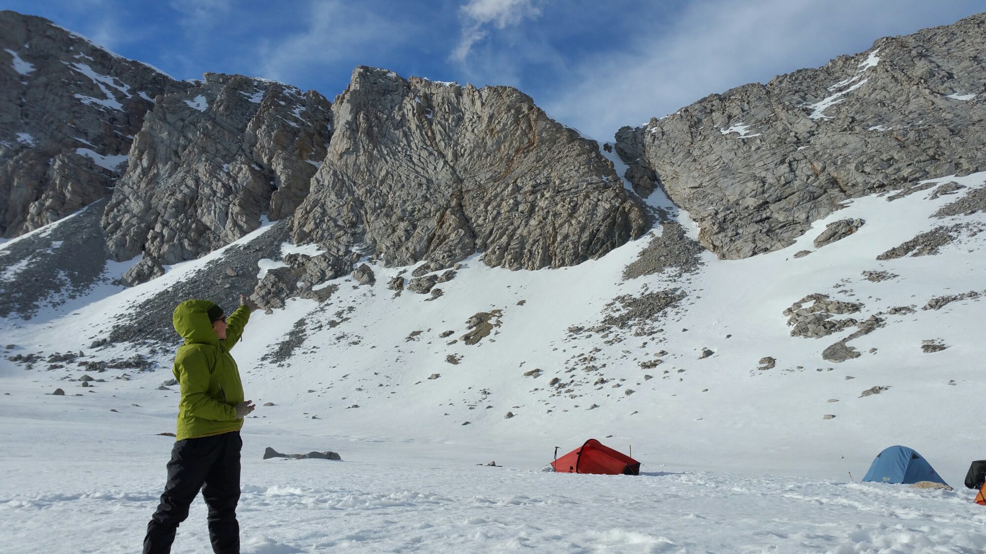 We made it to the base of Forester Pass by Thursday afternoon, and the winds had picked up considerably. We hiked up the long steep “ramp” from Tyndall Creek for 5 miles quite slowly because the snow was getting crusty on top and slushy below, leading to quite a lot of post holing. We crossed Bighorn Plateau, a giant space of lots of open air settled in between the high mountains on all sides, lending a feeling of being on the moon. Desolate, lacking plant life, yet such a strong pulse teeming with sounds of birds calling from afar, and water rushing in the creeks below the snowy surface. We were now above timberline, and we said goodbye to the last of the ancient foxtail pines as we climbed and climbed.