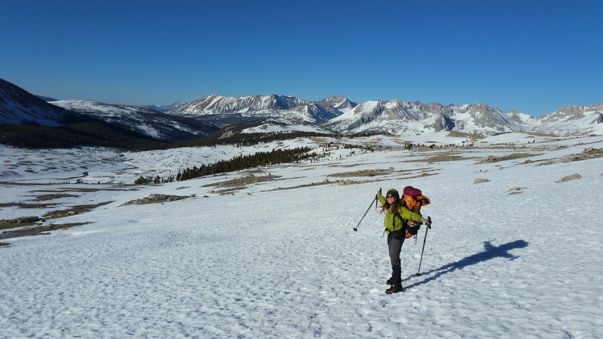 Actually, we did not hit the PCT at all, and one of the first things I learned about back country snow travel was that you do not have to be on the trail to get where you are going. With a map, compass, or a tool of technology, whatever it may be, as long as you have land marks and you know the direction you need to be headed, you are free to traverse the slopes, meadows and climb to the vistas. We later coined this concept with the term “hiker freedom”. One of my biggest anxieties going into the week, and the class, was that I was nervous about not being able to find the trail under the snow. Ned helped us alot with this, teaching us how to navigate from both a micro and macro standpoint. I can now say I feel much more confident and in fact, I love hiking over the snow, because you can walk anywhere you like. This allows you to look up and look around you much much more, because you have to be very observant of your surroundings. You have to orient yourself constantly, look for indications of the trail and of landmarks. You have to pay attention, rather than zoning out following a 12″ wide dirt path. This shifts things considerably. One of my favorite discoveries of the week was when we cut down a slope covered in snow, to bisect a section of trail that followed a drainage. We put on our foot traction and straight down the billowy tufts of compact snow we went, each carving out our own path down to a beautiful meadow below. It felt like a ride at Disneyland to me, I was like a kid again, almost hopping down the slope and able to dodge in and out of the trees on my way down. It was marvelouse and elating!