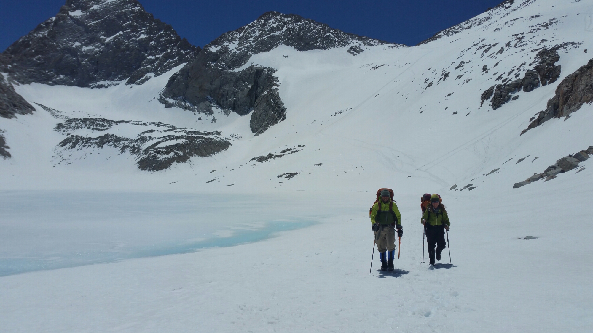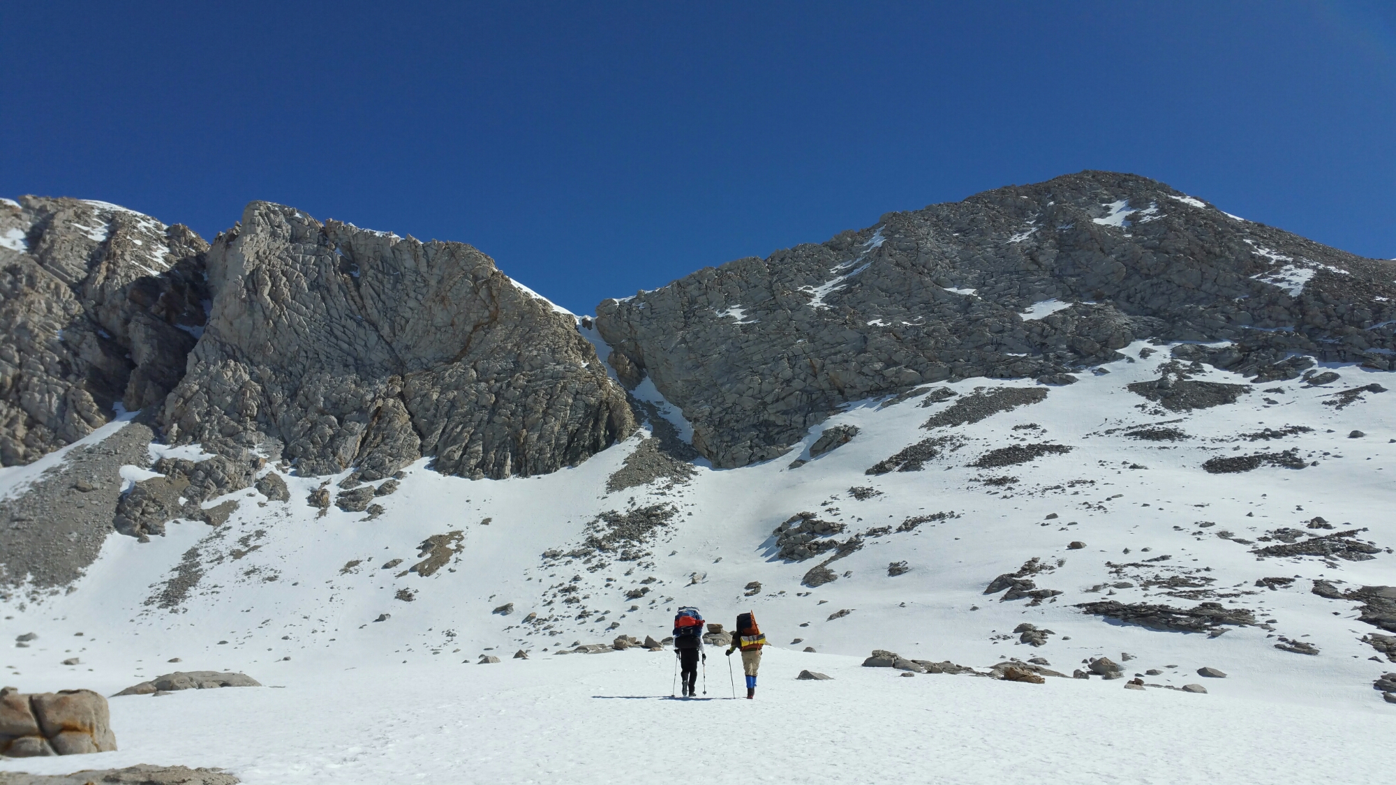 Once Ned had announced Shepherd’s Pass to be too dangerous and that he had phoned Search and Rescue, another shift occured, I am sure for each of us in the group. For me, it was almost a relief, but more of a switch from managing one crisis to another. Immediately I thought about getting off that pass and down to tree line where we could take refuge and wait for our rescue. It was also a disappointment to think that I would not be hiking on, that I would not be making it over Forester Pass that week, and possibly not at all. I even started formulating a strategy to join Ned’s next class, in order to continue “through”. However, in those moments in that freezing wind, the only thing that really mattered was getting into a safe, warm place. This was Ned digging a path in the traverse at Shepherd’s Pass: