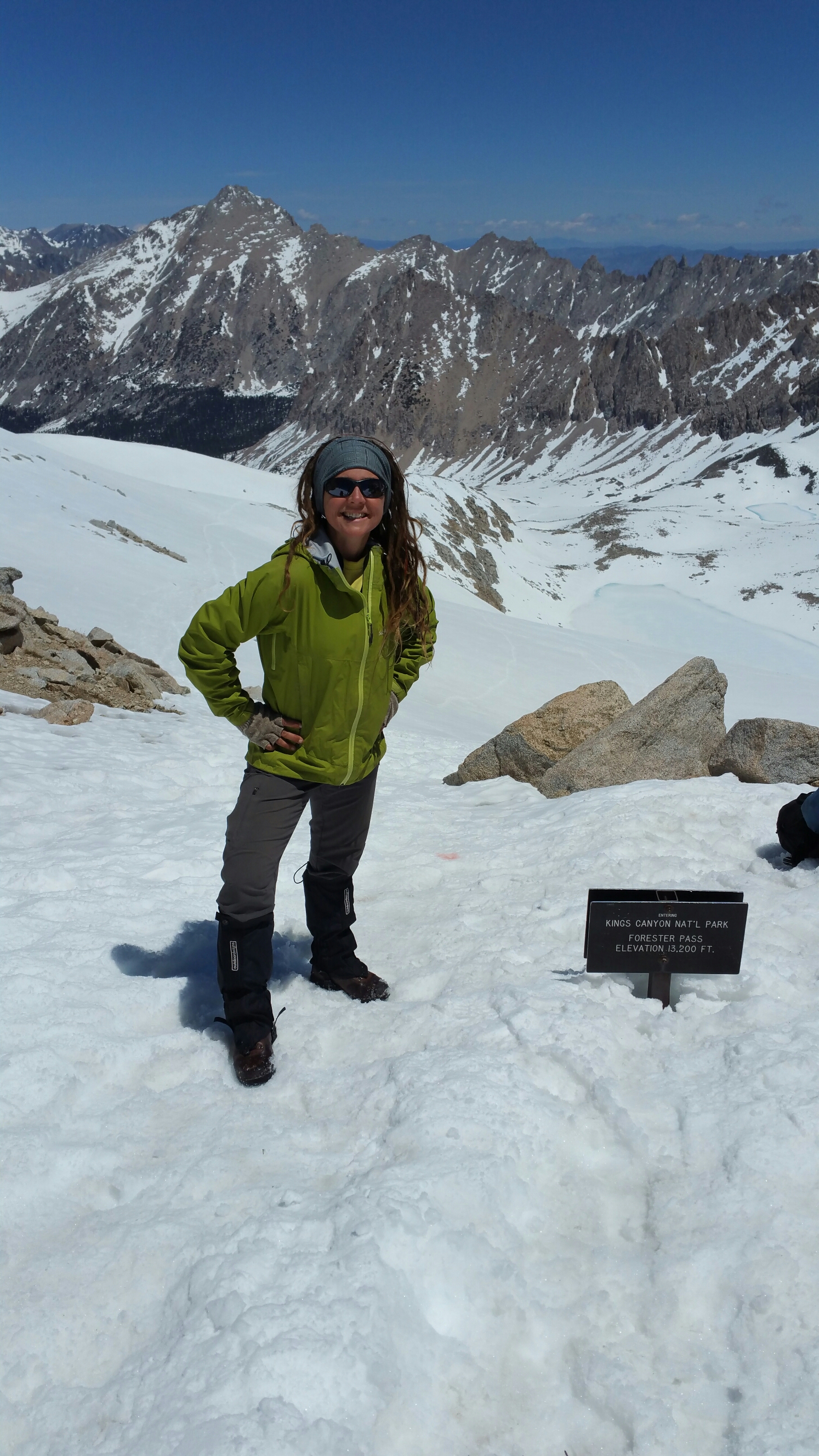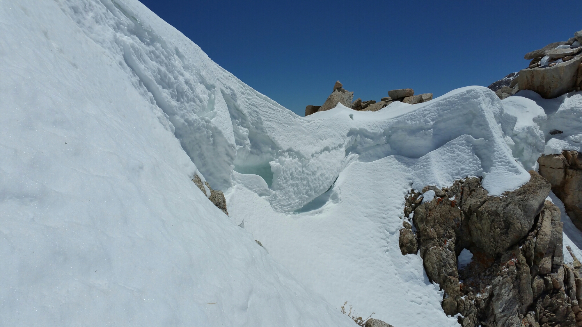 It was literally a sidewalk, about 18″ wide, enough for your two feet, and one trekking pole, and it was about 50′ across a slope of about 60 degrees. I continued across and hit the dirt switchbacks which were the final climb up to the snow cornice. Once at the cornice, I stuck my feet back into the snow, and calculated my grips with both hands and feet. I looked straight up a wall about 15 feet high, and saw there were little holes dug into the wall for your feet. For some reason, I did not hesitate, I dug in, and intuitively sunk my ice axe into the wall, and pulled myself up. When I made it to the top, I could not make the stretch to the last step in the ice ladder, and I had to use my knees in the snow for grip. I hugged the slope so tightly, feeling the weight of my pack wanting to pull me back, and I pulled myself up and over the lip. I stood up and took a giant breath, and saw just ahead of me, the metal sign, Forester Pass 13,200 feet, and I smiled as a few tears welled up in my eyes. I had made it, and this meant, I could make it through all of the Sierra’s as a through hike. I was relieved, elated and just grateful for it all, every bit of it. This is the lip: