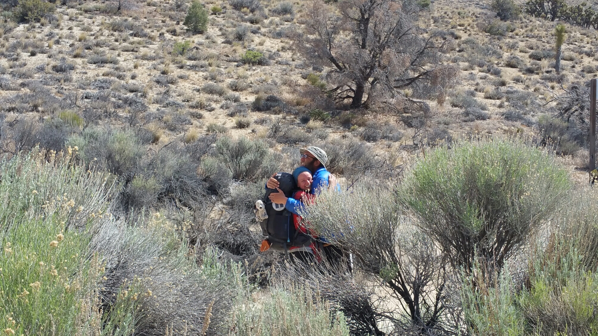 Day 59, May 22nd, our group headed out from Upper Vidette Meadow up to Kearsarge Pass to get out for a few zero days and resupply. I had gone through quite a few changes of plans within the adventure at Forester and with SAR, that I had asked my Mom to come and pick me up. I wanted to get settled and nurtured, to be “comforted” and get my bearings while I decided what I was going to do. This was how I felt when I laid in my tent the night we had contacted SAR, but those feelings largely disappated once the wind storm cleared, we had food, and we had a plan. That being said, I still welcomed my Mom to pick me up and take me home with her for a few days, which she did, and which Prince joined me. The drive from Lone Pine back to her house in the Paiute Mountains is about 4 hours, and passes over the mountains through Lake Isabella, and specifically crosses Walker Pass at the PCT. It was the strangest thing, I had this realization that we had traveled backwards in time. PCT time, of course. As we crossed the trail intersection and the campground where we had stayed only 16 days earlier, I noticed that I felt a certain resistance about being there, coupled with a strong sense of feeling disoriented. This “place” in time did not exist anymore. I was done with this section of trail, left behind in the dust, never to be revisited. I was no longer used to hiking in the dirt, I was in the Sierra’s and used to an all white landscape. Yet, people, other hikers, were just getting to Walker, and as a matter of fact, as we crossed the pass at 50 mph, Prince suddenly yells out “Oh my God, stop the car” from the back seat, and as my Mom promptly did so, he jumped out of the car and ploughed straight through a shrub to his hiker friend “Prunes” whom he had not seen for quite some time. It was trail magic at it’s finest, and a beautiful sight to witness.
