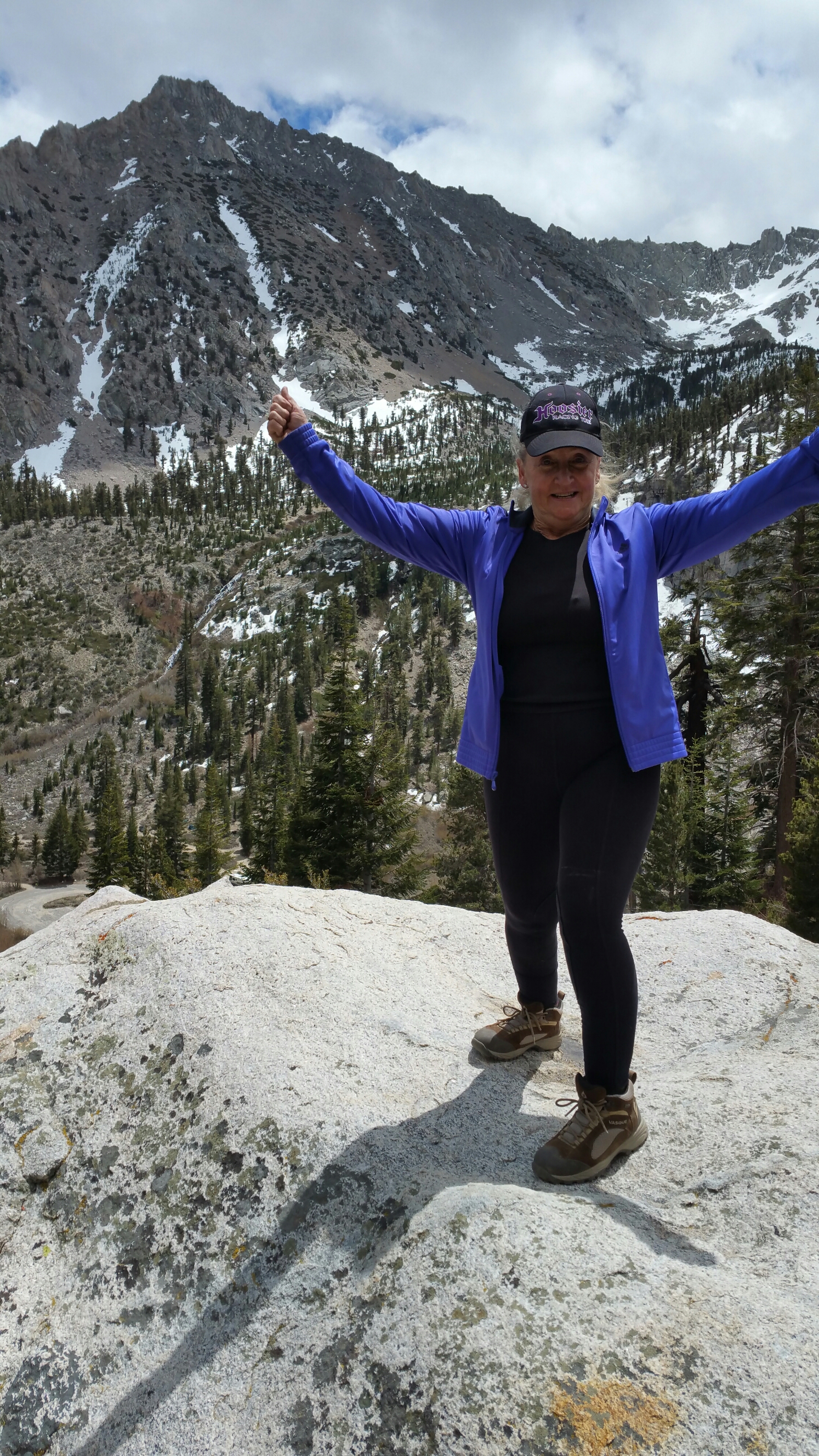Fast forward a few days after a super restful and nourising stay at my Mom’s, uh, I mean Calamity Jane’s, we headed back to Independence to get back on trail. My Mom brought a horsey friend with her, Alena, the pair of them were interested in checking out the Kearsarge Pass trail in hopes that they could ride their horses there someday. The two of them hiked the lower section of the trail while Prince, Overload and I shot around town getting our trail errands accomplishesd. Here is Calamity Jane claiming Victory over the snowy and rocky trail: