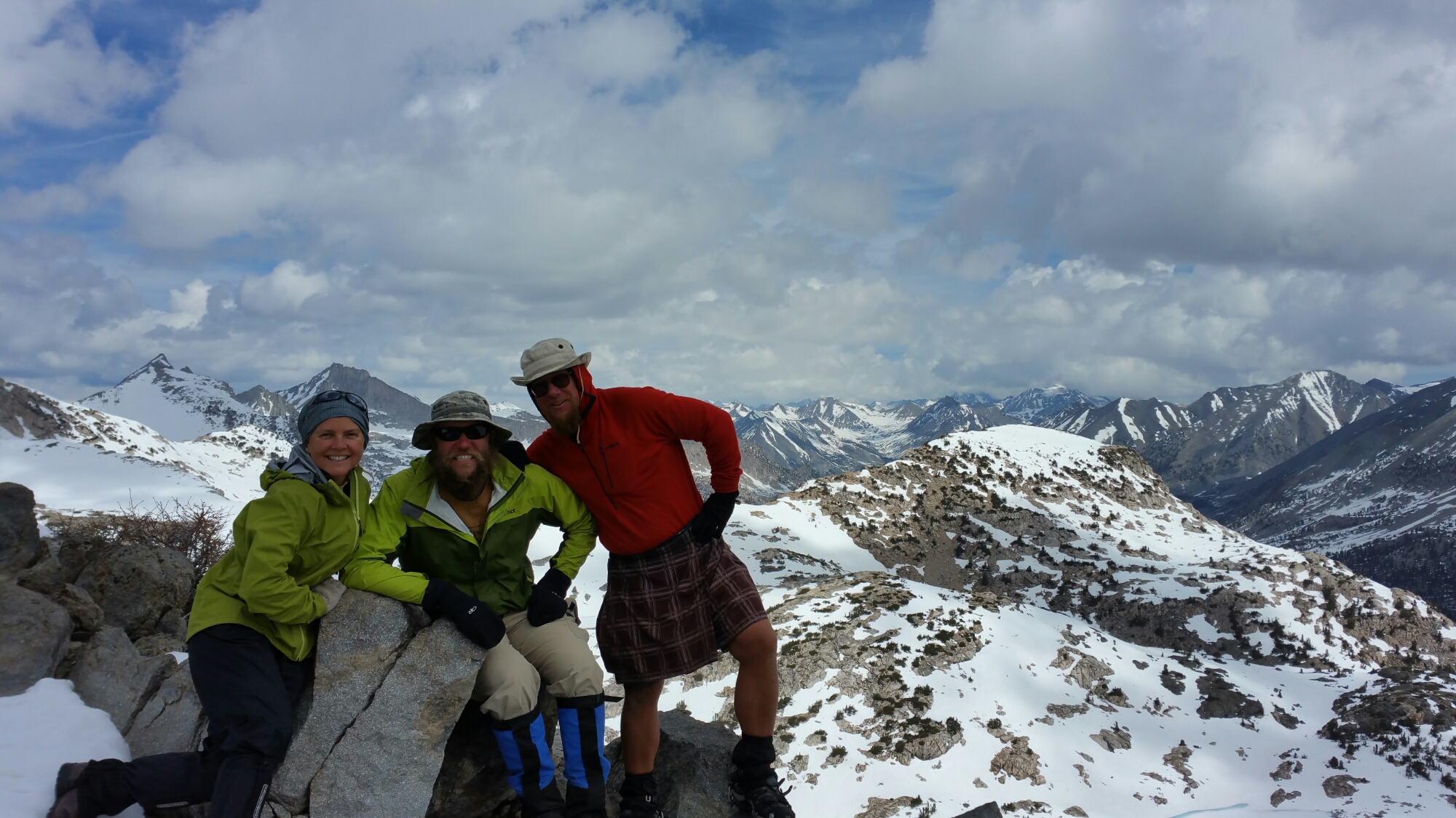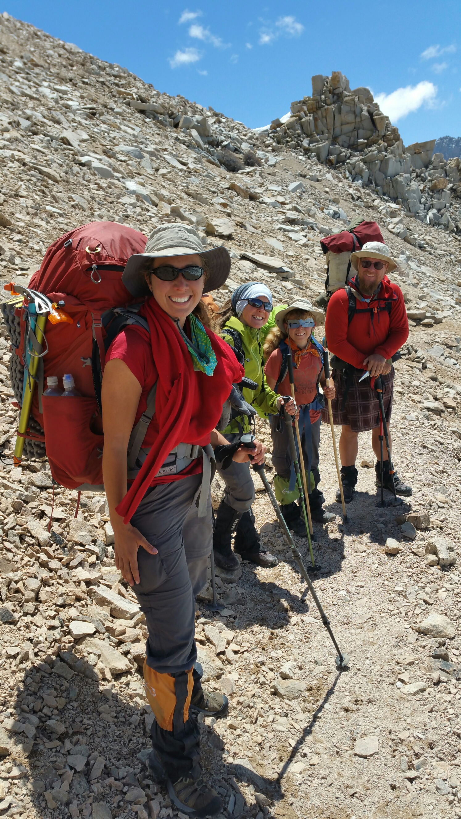 Day 64, was May 27th, we were finallyback on trail at Kearsarge Pass. Overload’s friend “Mountain Man” was kind enough to give us, along with Bobcat, a ride up to the trailhead early that morning. If my pack was heavy when I left Kennedy Meadows, it was heavier now. I think it must have weiged 55 lbs no joke, including my water. I am truly amazed what the body can tolerate, I remember hiking the JMT a few years ago, and thought my pack was SO heavy at 35 lbs…if only I had a pack that light now! Regardless of the weight, we made good time over Kearsarge and on the way down, we saw two small figures well below, moving steadily along up the switchbacks. People! It’s always exciting who you might meet on the trail. IN this case, it was non other than Team Emerson! Yay! We were so thrilled to see them, and to know they had made it over Forester safely. We exchanged many hugs and smiles and stories along that rocky slope.