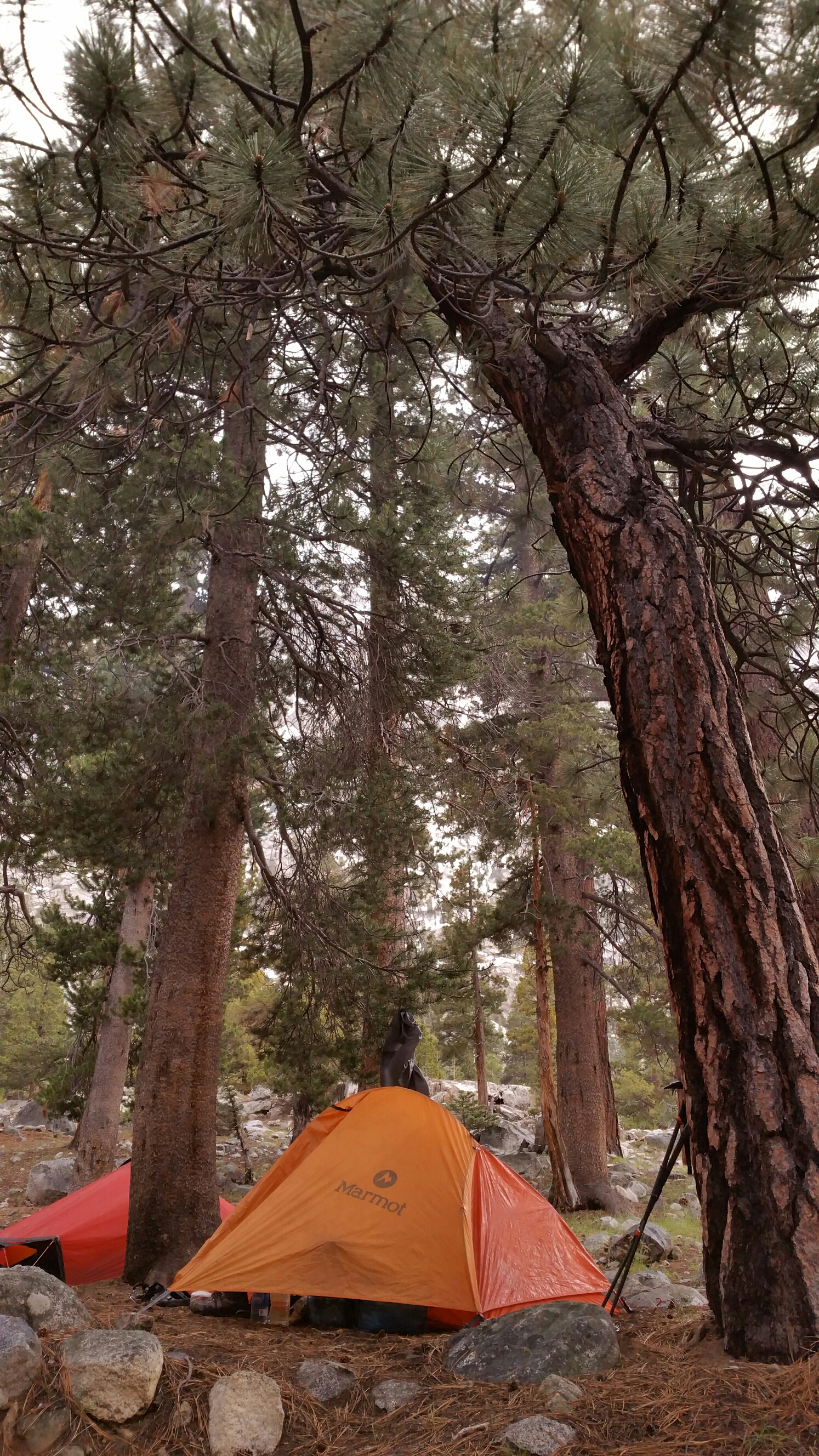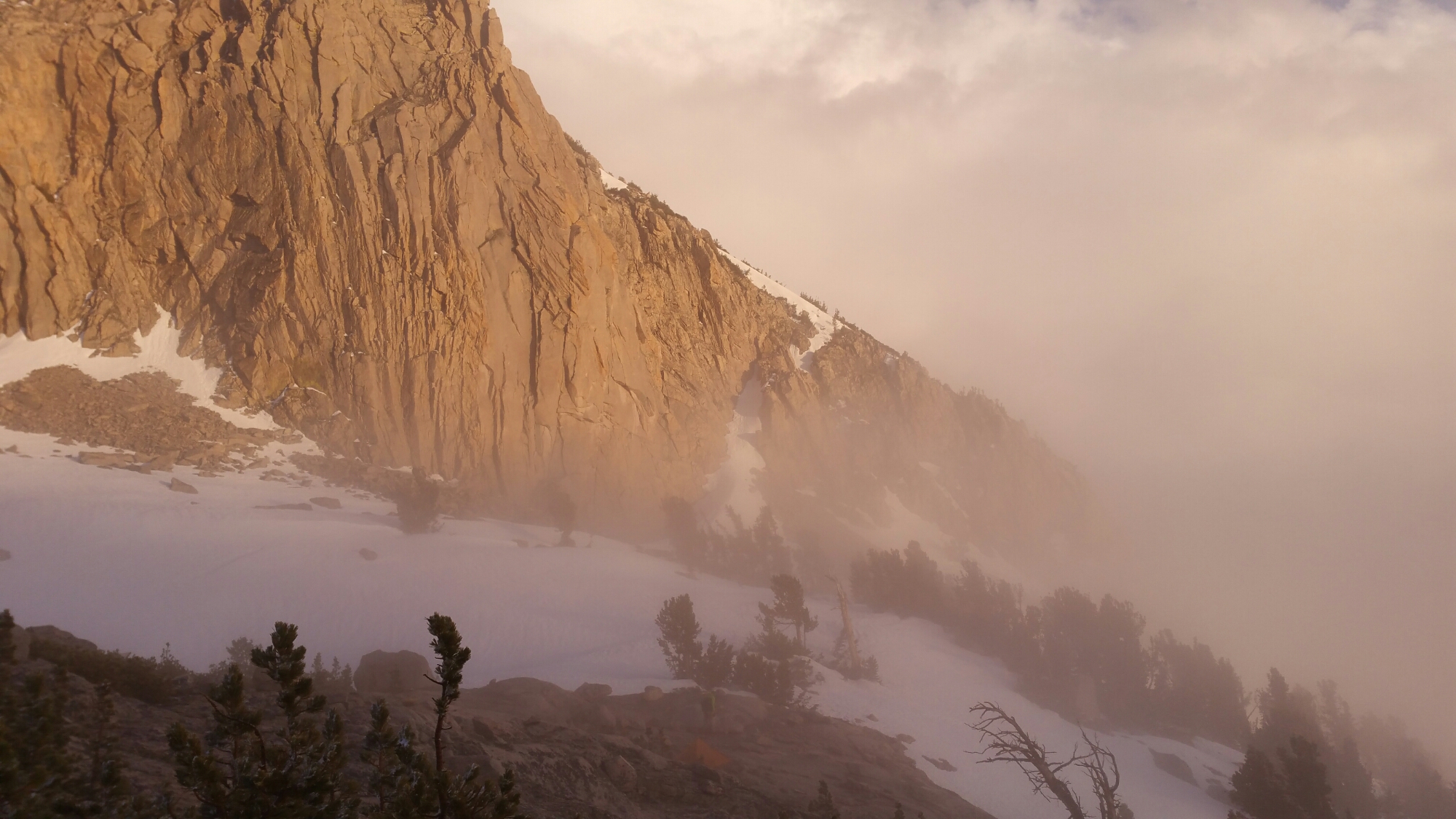 Later that day, as we ascended the slopes back into the land of white, just about 2 miles before Glenn Pass, we scouted out, and got creative with, a campsite on the granite. Just as we finished setting up camp, the clouds we had been watching all afternoon finally decided to drop some precipitation on us. I was in my tent already, had entered that stage of consciousness that is neither sleep nor awake. The droplets began to hit my tent, they were clearly not water splatting, and as I could see through the low opening under the rain fly of my tent, there were tiny little balls of hail. Passing back into that dreamy state, the hail came and went, eventually turning into a slushy snow that came down for about an hour. When it was time to rouse myself for dinner, and the sun was just about to duck behind a ridge, I exited the warmth of my tent to find a thick layer of fog enshrouding the peaks around us, and also, I found a layer of white had collected on my tent, and had to sweep it off with the top of my cook pot. Two uses for all items in your pack!
