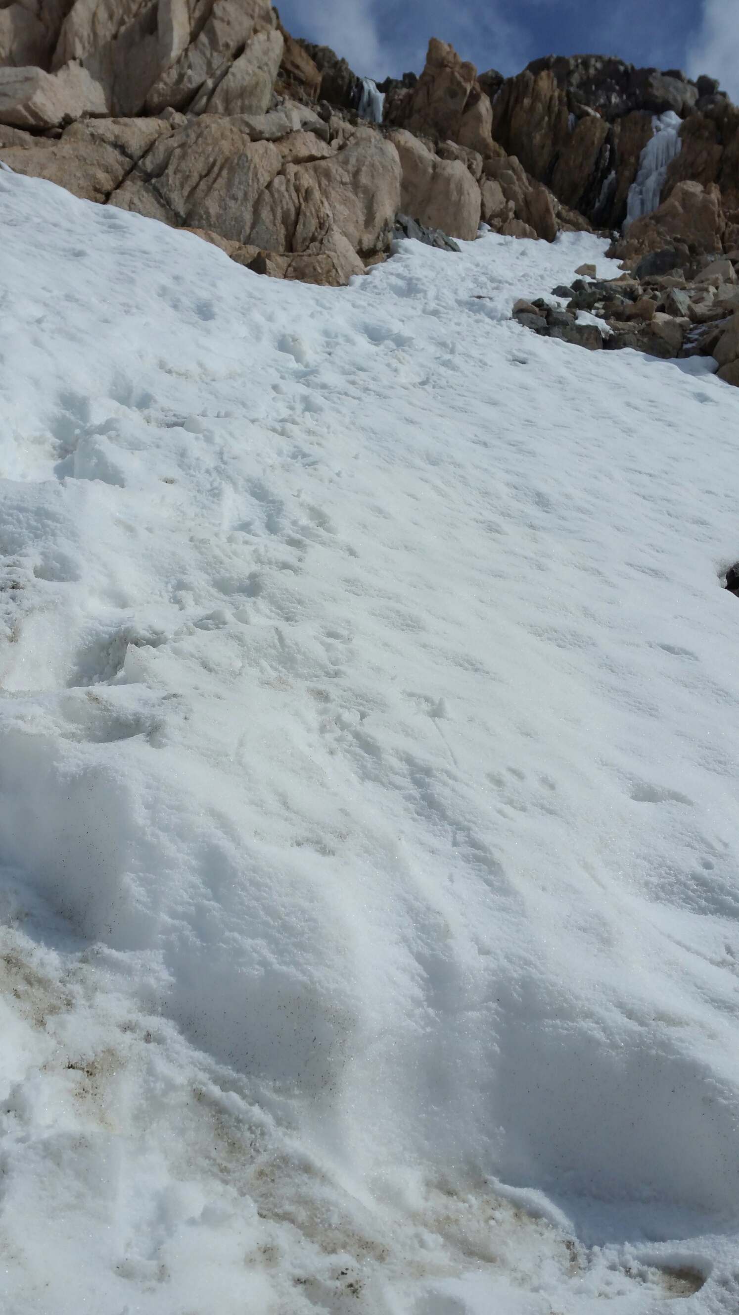 Day 65, May 28th we let ourselves sleep in a little bit, as we were only 2 miles away from Glenn Pass. Knowing it was steep on the North side, we thought it would be safer to descend once the snow got a little soft, rather than skating down the ice crust of the very early morning. I had mixed feelings approaching Glenn. Glenn is a steep pass with a narrow, knife like edge top that does not give you much room to sit and relax once you summit. I like this feature about it though, as you can truly enjoy views of both sides of the pass simutaneously. I remember this pass being my favorite of all the passes on the JMT because of the stellar views on either side. So, I was both excited and scared, but more excited. The ascent started out fine enough, traversing the slopes in a steady upward direction, gaining feet with every deliberate step. The snow was nicely consolidated and my crampons iffered ne security. Towards the last 20% of the climb, there was a steeper section, in which I had to really concentrate my efforts on my climbing steps, my footholds, and my balance with my trekking poles. It’s just not cool to slip on this terrain, even a loose foot can send you sliding down 300ft into a frozen lake, so I tend to take this seriously and use all my faculties to concentrate and be steady. This makes me slower, but I am okay with that, totally okay with that. After about 30 minutes of this intensity and scrambling over some rocks and passing by a frozen waterfall, I made it up to the final rocky switchbacks to the pass. I was home free! This is that last section with the frozen water fall up in the distance: