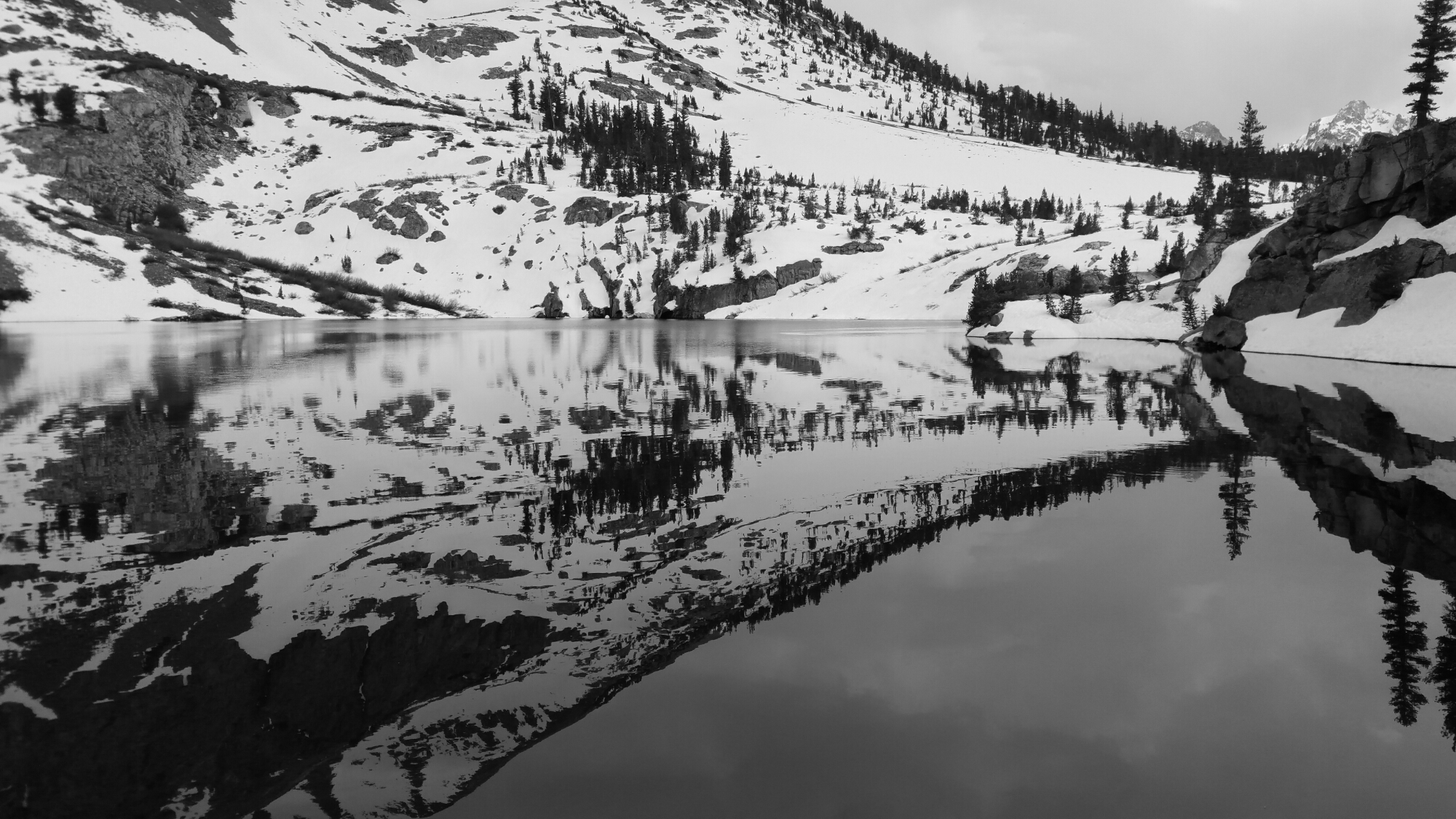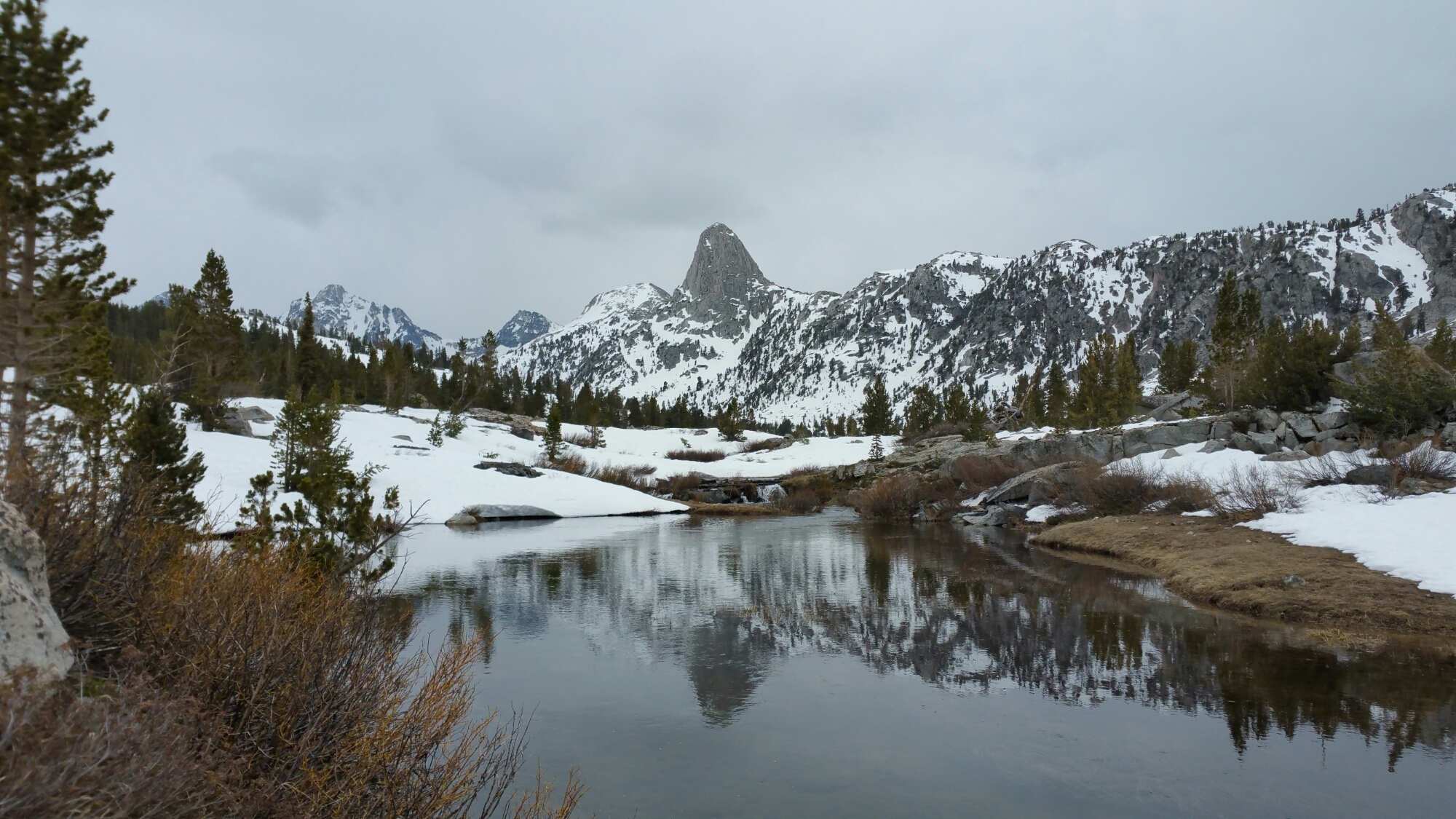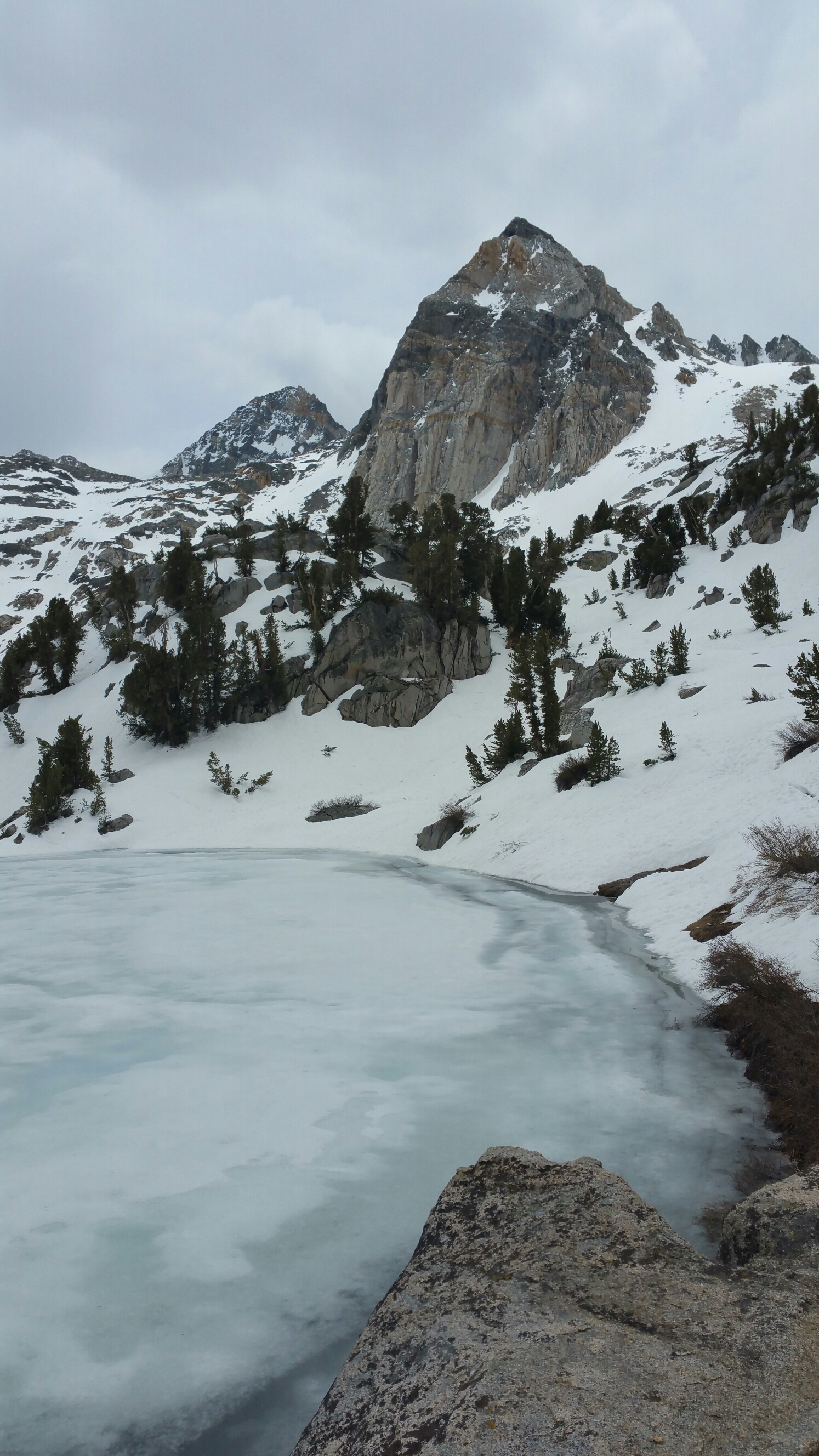 Well below Glenn Pass, to the North, is the Rae Lakes area. I had been eagerly anticipating reaching this point on the trail, as in times past I had to pass through so swiftly, longing to stay there and enjoy the beauty. Last time I was there it was Indian Summer and all I wanted to do was sink my body into the emerald green water. Oh how different it was now! The Rae Lakes are set tightly together and nestled amongst giant scultpures of rock, one of them famously named “The Painted Lady”, a prominent round dome that has a pinkish hue. Another famous piece of rock is known as “Fin Dome” which sets itself nicely in the backdrop of a North lying lake just up the trail, Dollar Lake. In between all of this magestic scenery are creeklets and a plethora of running water overflowing into ponds and water flowing all over the trail. The sharp left turn and ensuing descent from Glenn proved to be a bit of a challenge for me, as it was very steep. There were steps cut by other hikers downslope, but as I have come to find out often enough, steps for people 6 feet tall don’t often work for people who are 5 feet tall. Nevertheless, I used them because my attempt to cut my own steps and heel plunge proved futile and I slipped and had to self arrest. That was enough adrenaline for me, and made my legs shaky. I slowly continued down down down, until I caught up with my team who awaited me at a prominent rock outcropping. The dark, foreboding storm clouds were, at that point, rolling in so we opted to gear up for the oncoming precipitation, which hit only moments later. We continued our descent in the falling snow which gave it a magical quality. Fortunately, we were able to glissade a few times, allowing us to safely drop a few hundred feet in elevation rapidly. Honestly, I Love glissading and am happy to give it a whirl every chance I get. Ned had informed us not to glissade with crampons on, in case they would catch in the front and send you into a dangerous tumble, so I would take them off and on, off and on. One time, gaining some confidence, I decided to glissade with my crampons draped over my left hand so I wouldn’t have to take off my pack to fasten them on. I could also call this strategy stupid, because when I got to the bottom, I had only one crampon in hand. Where did the other one go? At what point did I let it go? I started to dig in the snow around me, and a slight feeling of panic began to brew. Fortunately, Prince had eagle eyes and he was able to spot it sitting at the very top of the glissade. Yes, I climbed back up to retrieve it, and got to do the great glissade all over again!