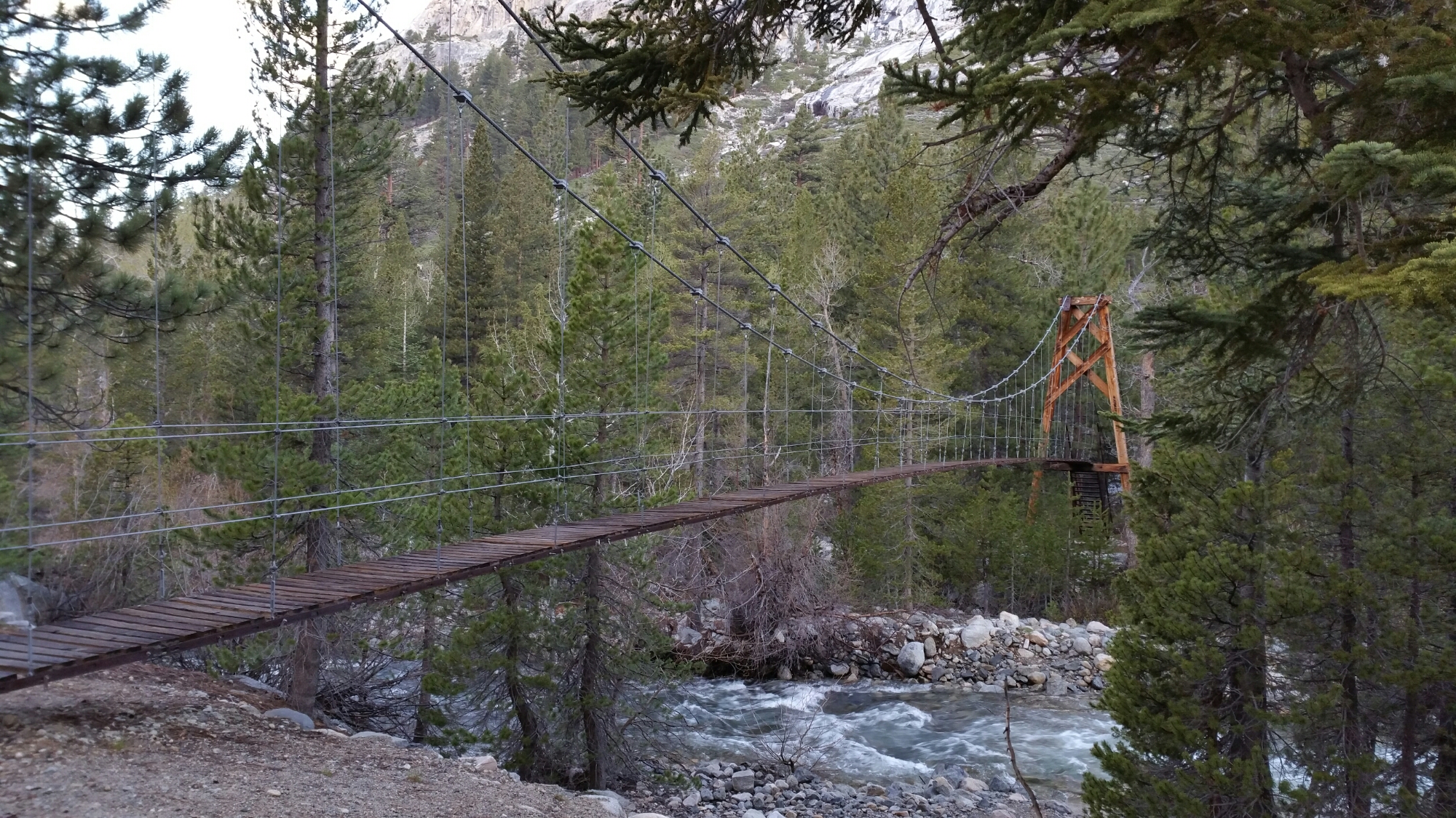 After the Lakes, we descended 2,000 feet all the way to Woods Creek. The trail was rocky, technical, and wet. This section of trail was interspersed with snow patches and lots of water trickling right on trail. Wet feet were inevitable. By the time we got down to the 8,000 ft elevation at Woods Creek, were were once gain in the graceful presence of the conifers, my beloved freinds who offer a sigh of relief, comfort, color and shelter. We camped at the sites right near the Woods Creek Suspension Bridge, also known as “The Golden Gate of the Sierra”. I LOVE this bridge, and was happy to be about to cross over the raging creek once again. In times past, I had looked at this bridge crossing as a sort of fantastical “through the looking glass” portal, like crossing into another dimension. This time, however, I was already in another dimension, and the bridge did not change that further. This dimension I was in now, began just North of Kennedy Meadows, and will not shift again until I am North of Tahoe. I was still excited about the bridge crossing though, because it marked time and space, and it was a fun, bouncy bridge high above the water. But crossing it would have to wait until morning. For now, it was time to set up camp and duck out of the rain. I was beat. I was wet. I was so thankful to have made it over Glenn Pass safely, to be back in the trees, to be warm and getting dry inside my tent, and to be discovering the JMT from a completely new perspective, heading North, in the snow, seeing the landscape from an entirely new angle, and hence, having fond memories of times past as I fused the worlds of two distinctly different seasons. I fell asleep that night, once again, to the sound of the patting rain on my tent, the full rushing water of Woods Creek, and the gentle running creeklet that flowed just below where I rested my weary body on the Earth.