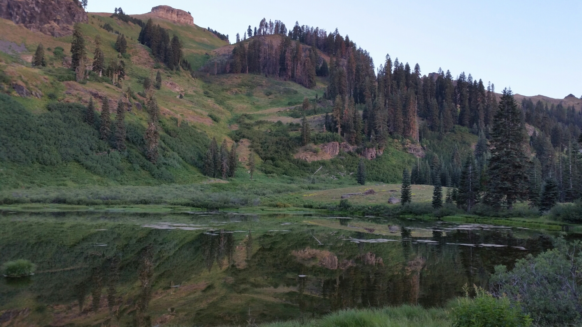 This morning I woke to peace. We had camped at a lake called Paradise, and it was quiet, warm and surrounded by a thousand foot wall of rock. When I woke this morning I was sure there was cloud cover beause it was so warm out. Nope.Wrong. Just warm at 6:00am. But the lake sure was pretty: