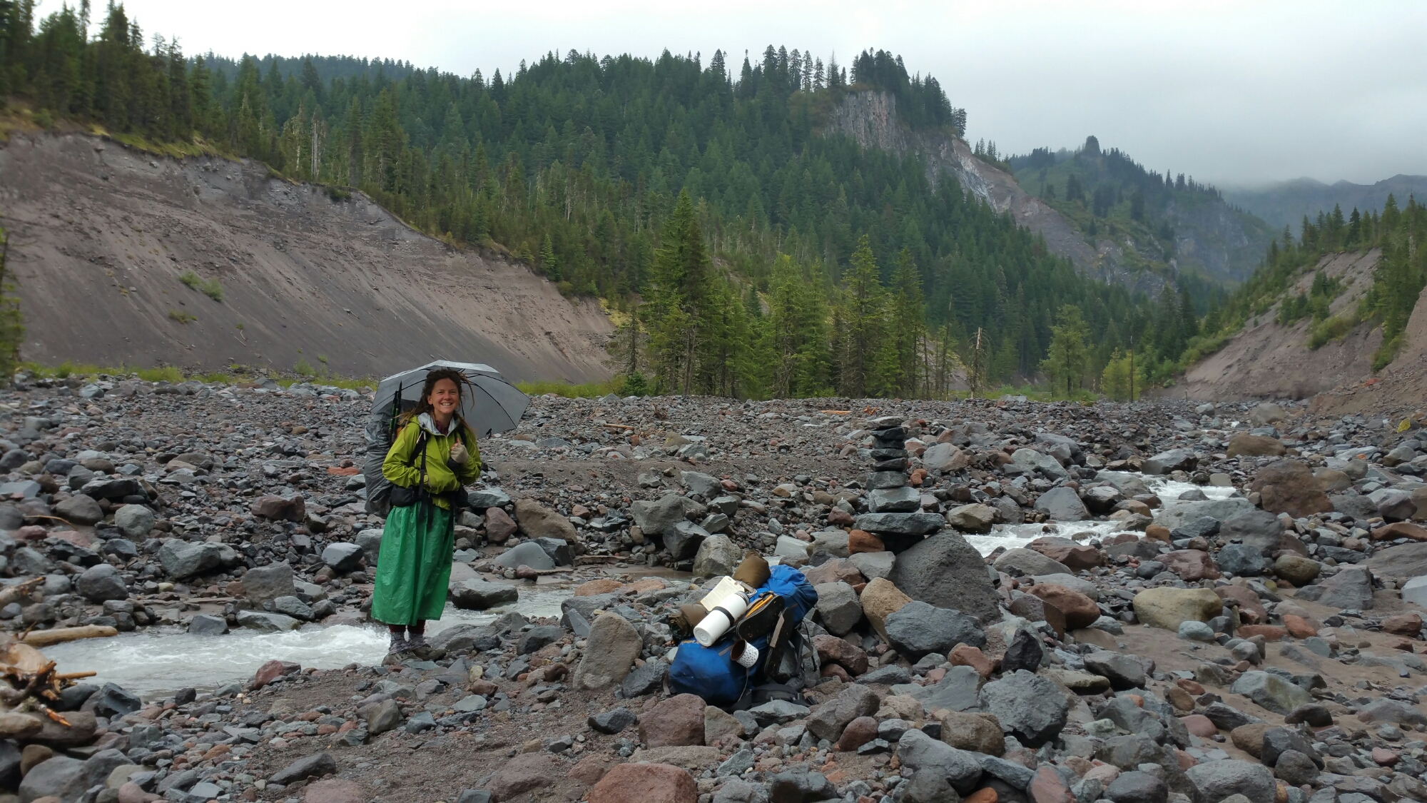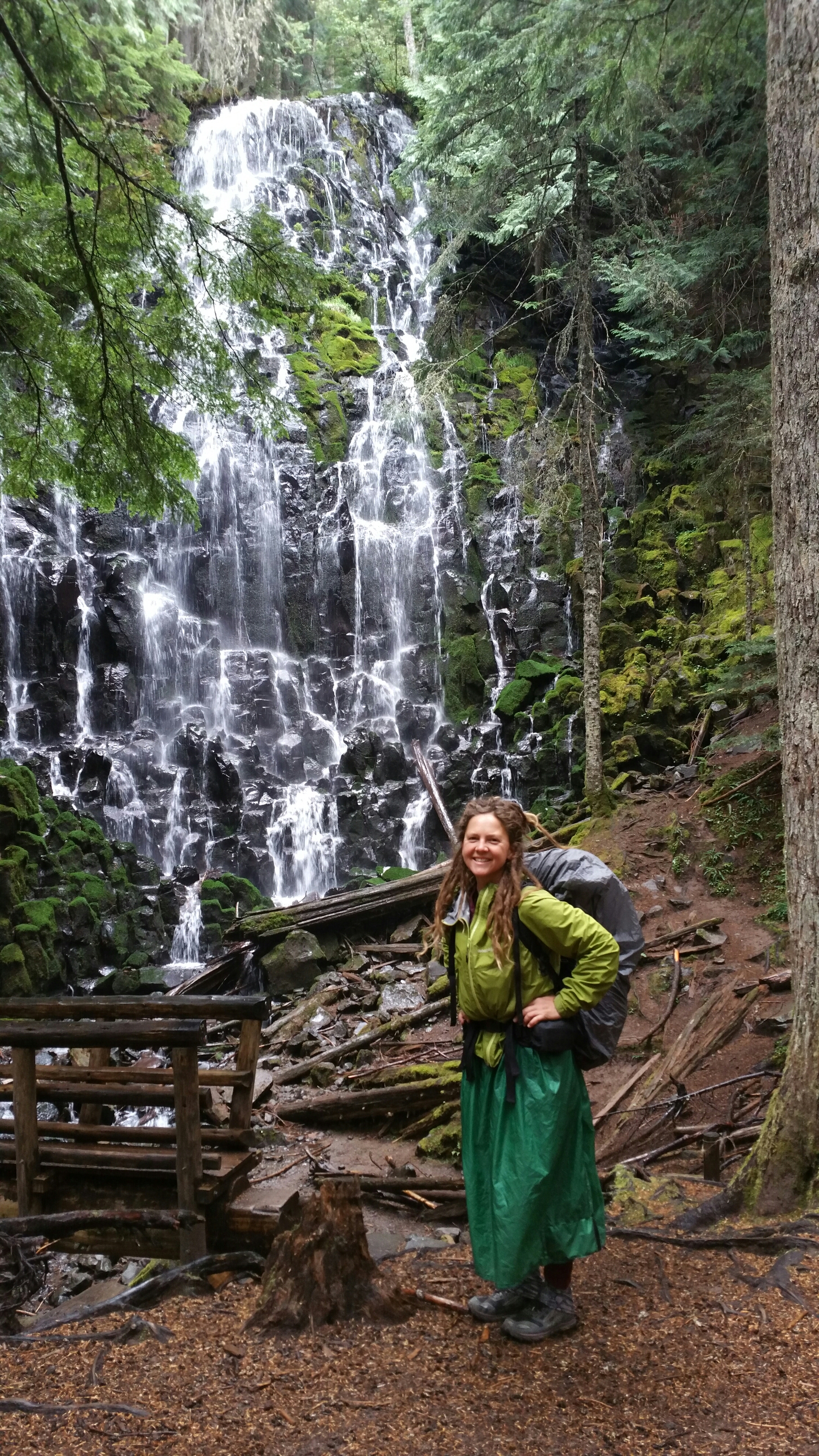 No matter though, this day was the day of my Mom’s birth, so I would be thinking of her all day and sending all the beauty I was absorbing out her way. I was also looking forward to two prominent and legendary waterfalls coming up that day and the next, just before I would reach WA. I found myself walking happily in the rain, as it was not so heavy that I was getting soaked. I entered a forest that became wetter and greener, the deeper I went in. When I reached Ramona falls later that morning, the same couple was there and I asked them to take my picture next to this gorgeous waterfall.
