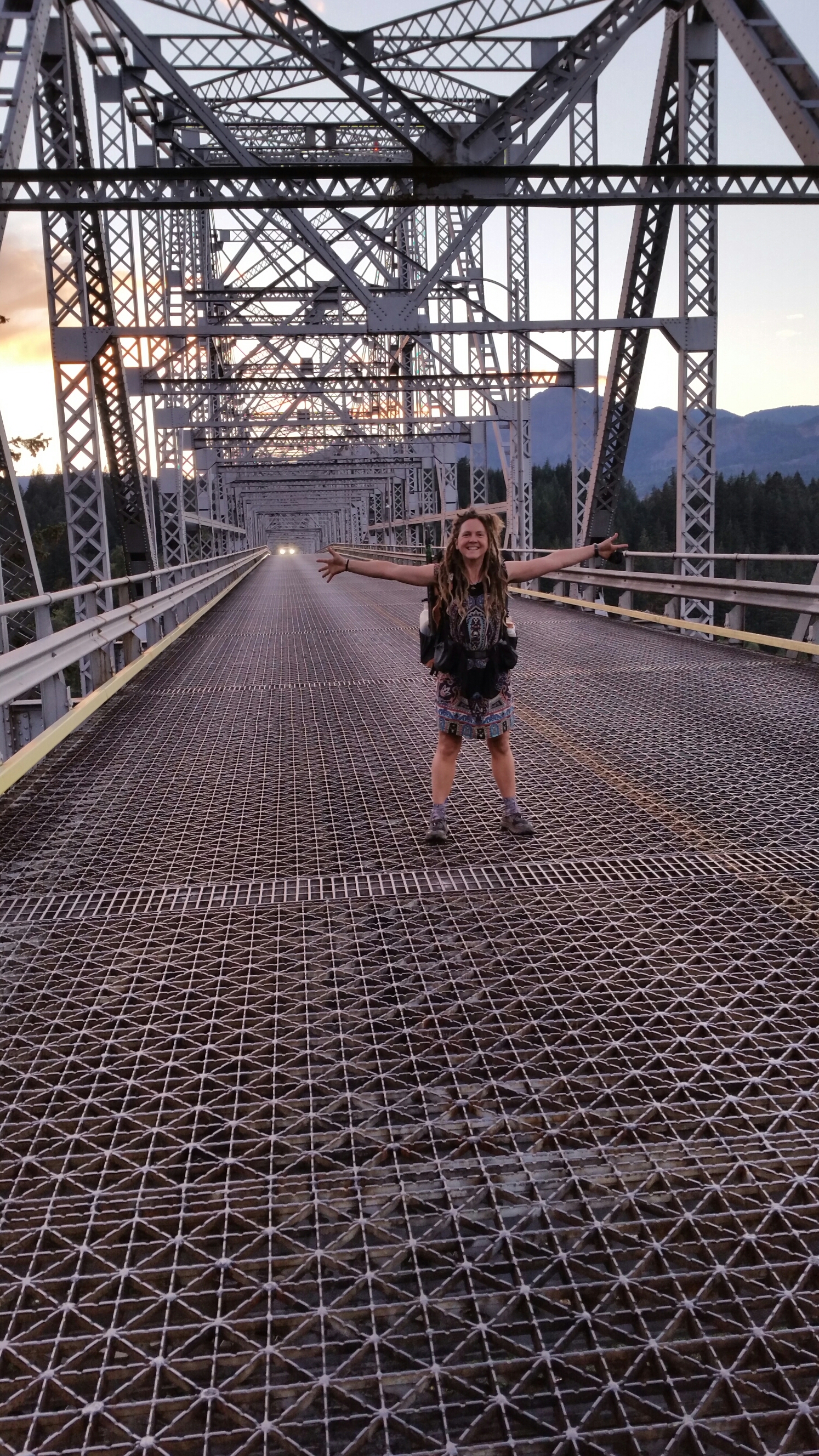 I stumbled along more and more slowly, knowing I was delaying my arrival at the Bridge. I was not feeling particularly strong, or elated, or motivated. I started looking for places to camp and stay in that forest near the gorge, but found lots of signs that said “no camping”. I just didn’t want to arrive at the Bridge alone and not feeling enthused, I wanted to feel elated and inspired. They say that the trail provides, and it does, it truly does. The trail holds the space. No sooner had I decided that I was not going into town that night, did another thru-hiker named Quotes came up behind me, and walked with me, we started chatting. All the gears suddenly clicked back into place and we started a lively conversation, and my pace picked up to match his. This all shifted my plans and suddenly I felt like getting to the Bridge after all, and felt like going to town for all the niceties. We walked together for the next two hours, with the final three miles being along a road paralleling the Columbia River, which we could not see. My feet ached and burned so badly, yet at this point I was determined to get to that Bridge before it got dark. Having someone to talk with is a great distraction from your pain. Quotes and I gabbed away and shared stories of the trail, of each of our separate journeys thus far, and our hopes for finishing. We got along fabulously and when we reached the Bridge, we had someone to share the moment with. I did feel elated, proud, excited, happy, and of course, humbled. In my heart I bowed down to that Bridge and that sunset over the river, and ultimately I bowed down to myself. I have made it to Washington.