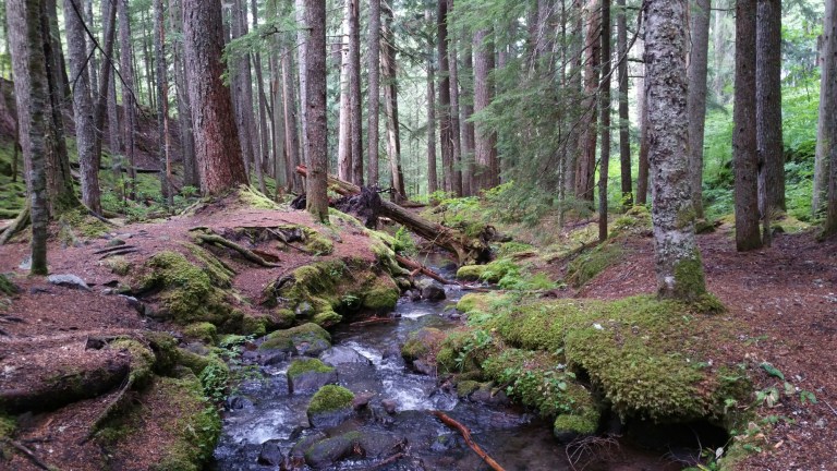 Straight away after the waterfall, I proceeded to begin walking uphill for about 30 minutes before I realized I was on the wrong trail. Ugh! There is nothing like walking extra miles out of the way on your thru-hike, especially when it’s uphill, and in the rain. It was a bit of a bummer, and I felt like I lost time, but when I finally got back to the PCT and heading in the right direction, the rain had taken a brief repose and some sunlight was starting to warm the interior of the forest. I found myself walking along side a gentle stream which was surrounded by ferns, mosses and lichens. The whole forest was dripping, sighing, expanding and contracting, it was so alive I could feel it’s pulse in my own and the oxygen filled my blood as I practically levitated along the trail, feet lightly connecting with the spongy damp earth.