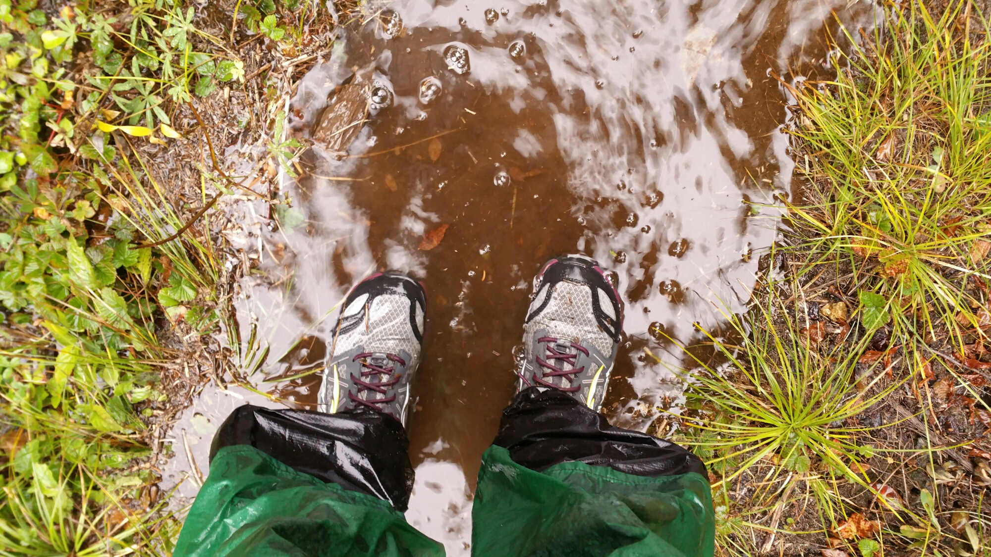 Walking back into the forest, the low shrubs and grasses grazed my lower legs and feet and within an hour, my feet were soaking wet. I was enraged. I paid good money for these special shoes, these $160 Altras, as advertised in Backpacker Magazine to be what you need in rain and snow, and here I was walking in the rain for the first time since I got them, and my feet were wet. My legs were wet, too. These “rain skirts” are supposed to be ultra-light, which they are, and protect your legs from brushing up against wet plants. Well they do this, up to the lower leg where the skirt stops. I even wear mine long and my lower legs still got wet. That is, over my rain pants, which were wet, too. REI women’s rain pants, the inner lining shredded after I wore them with shorts on and used them for glissading in the Sierras. These pants were only good from the knees down. My solution, wear both pieces of equipment, which not only weighs more, makes me sweat more, and costs more, too!