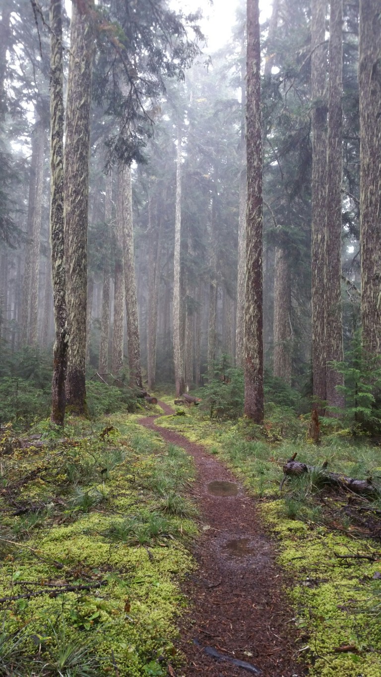 I heard faint music coming from Crush’s tent. It sounded like meditation music, soft, flowy, spiritual, just right actually. Later I would find out it was Sarah McLaughlin! So, here I was, still comfortable and dry in my tent, about to face the world of rain all day. I was determined not to get too wet, and glad I had my new Altra shoes which were marketed to be weather resistant. I wore my rain skirt, rain pants, rain jacket, and used my umbrella and pack cover, I was all set for the wet. Upon packing up my tent, I laughed at the location and position of where I had slept, but actually it was pretty comfortable! DJ was gone way earlier, and Crush was “doing surgery” on her blisters, so I set off into the wet forest alone.