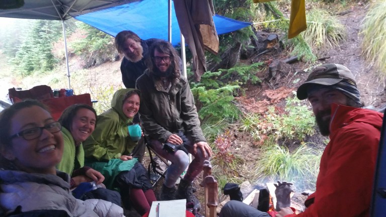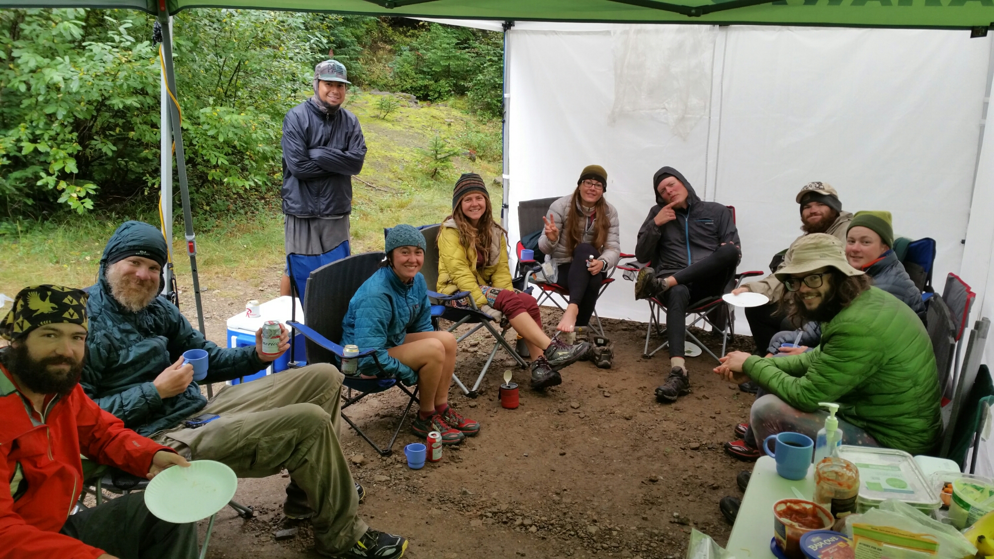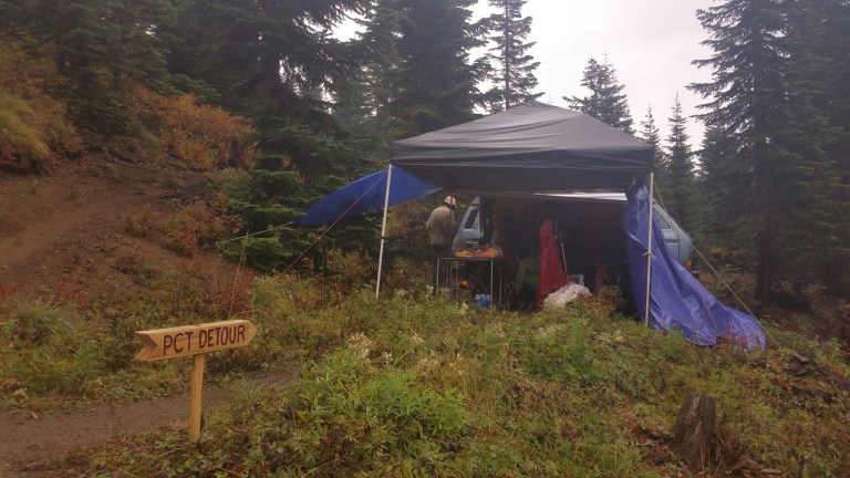 We were welcomed warmly and ushered into the shelter from the rain by a PCT alum named “Stumbling Norwegian” and his group of friends. They had parked their van there all weekend, set up 2 pop-up tents, put out chairs, including lounge chairs, had coolers with beer, water, soda, and had a full kitchen set up. They were going to be cooking hot soup for dinner and breakfast burritos in the morning! This is like a dream, like a prayer, Trail Angels are Real!