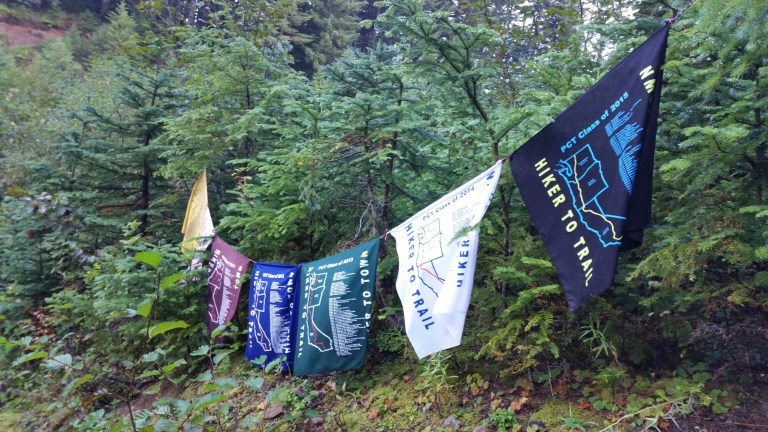 We hiked on, trying to push, wondering how far we could afford to hike on in this continuous rain, and how many miles that would leave us with the next day getting into town. Our goal was to make about 7 more miles that afternoon, which would leave us with 14 the next day. Not bad. We were hiking at a steady pace, sticking together now, chatting incessantly about how cool of an experience we just had and how powerful Trail Magic is. After about 3 miles, we came to an opening in the forest, where it looked like there were prayer flags hanging in the trees. What is this? We walked a little closer, and then heard voices. As soon as we reached the prayer flags, we realized they were PCT flags, and suddenly there was cheering. Just at the side of a road, were a whole group of hikers receiving more Trail Magic from another group of Trail Angels. Seriously?!