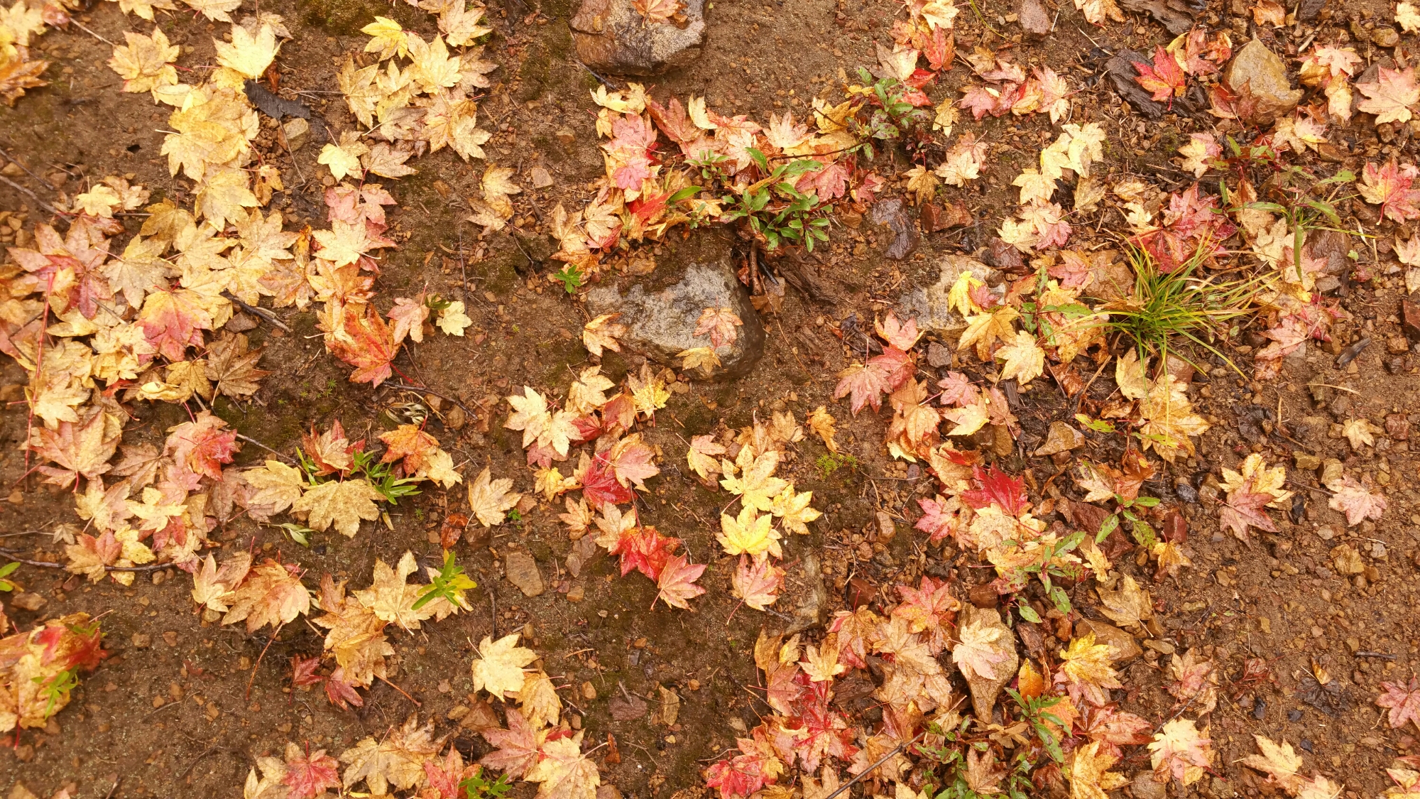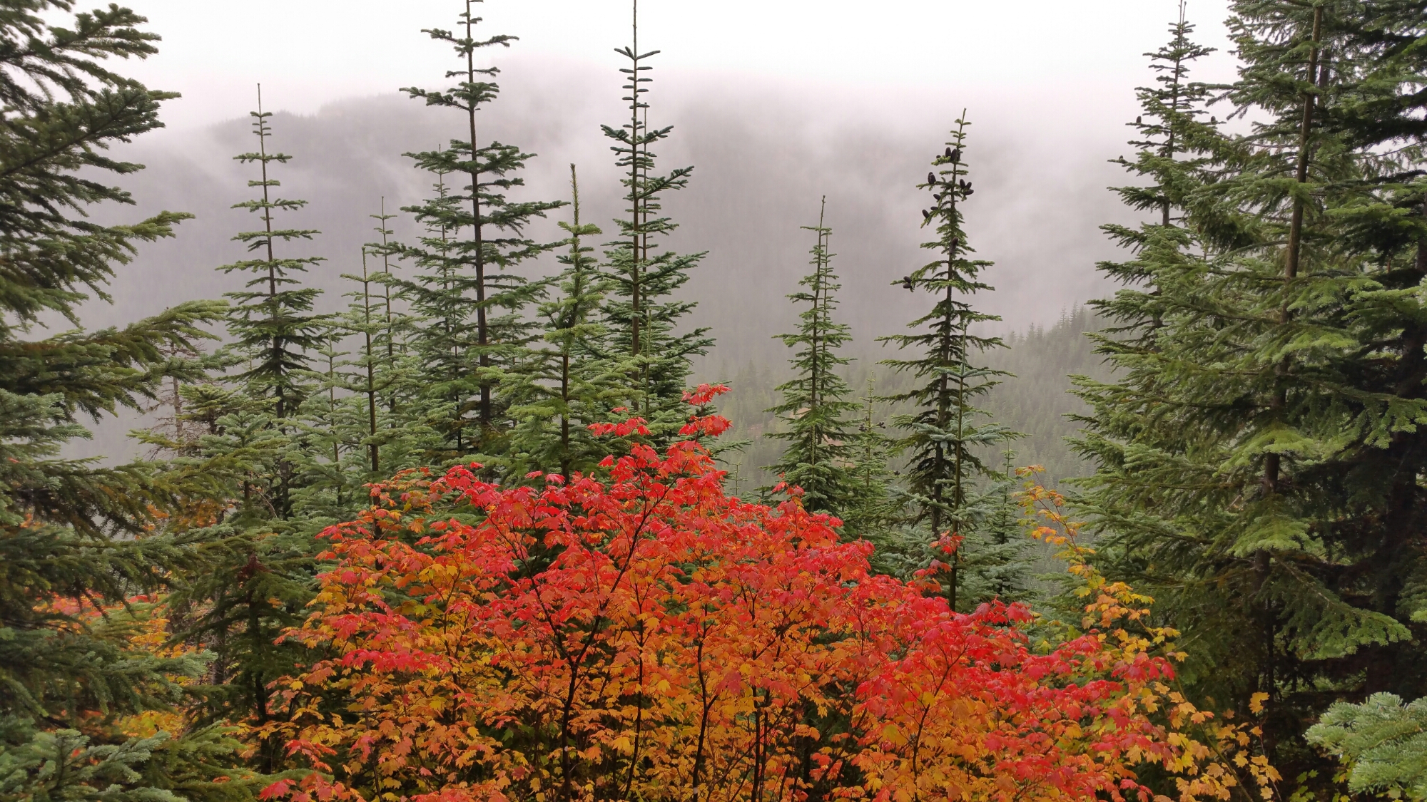 The forest was peaceful, and I enjoyed how quiet the sound my feet made as I padded along on the cushy, wet Earth. The dripping of water from the trees was lulling, and the mist and fog faded in and out around the trees and amongst the hillsides, constatly changing. Emerging to a bend and opening in the conifer forest, exposed some broad leaf trees (mostly maples) displaying the most electric Fall color I have seen in a while. New England, Kyoto, move over!
