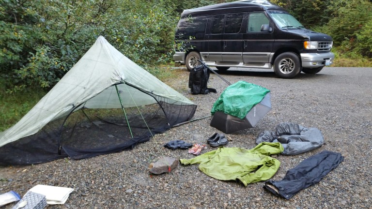 There was no way we were not stopping there for the night. It was, after all, close to 6:00pm anyways. It was not easy to find a place to pitch our tents though, all the “good” spots were taken. Is this becoming a pattern?  So we finally worked a compromise and pitched on the gravel “driveway” near one of the vans and just enough off the road nearaby that passing trucks would not run us down. Some hikers pitched along the side of the road, brave souls that they were, I would not have been able to sleep that way! It was a process getting everything set up, not a single piece of dry gear except, fortunately, my bed and my sleep clothes, critical! I laid all my gear out on the ground, don’t ask me why, it was still raining, but I think I was trying to be organized. It all ended up in a pile inside my tent anyway.