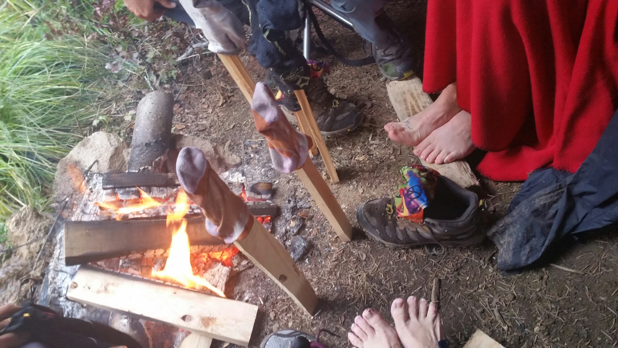 Trail Angel Rodger had a hiker hut all set up for us complete with chairs, fresh fruit and snacks, HOT beverages of our choice, and a FIRE! Oh my gosh, what a relief! I walked right over there, finding all my hiking companions in there getting warm, drying our socks and shirts, and out walks Rodger with a cup of Hot Chocolate and placed it right into my cold hands. How heart-warming this was! Not only was it heart-warming, for some hikers, it might have been life-saving. Crush, for one, told me later that she had literally been worried for her life and was running along the trail all morning trying to stay warm. By the time I arrived, she had been there for over an hour. Fun Size and Shake N’ Bake were there, Tesla was there, too and it was his Birthday! Several other hikers were there and the vibe was awesome, such comraderie, such shared miserable-bliss.