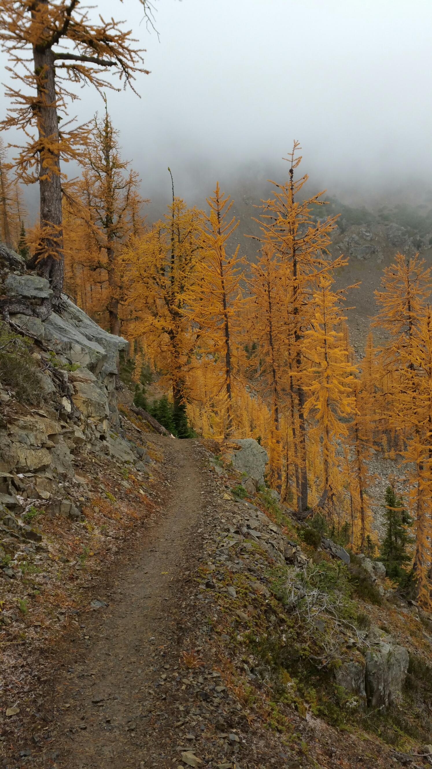 We arrived back at the trailhead in the mid afternoon, and said our heartfelt thank you’s and see you soon’s to Wildfire, as she was going to meet us again at the Monument in just a few days time. Oh my gosh, it is so close, Canada is just right there, it’s really going to happen. It was hard to comprehend the end still, and I knew the best thing for me to do was just to keep hiking and being present in the moment until I got there. We had a bit of a climb that afternoon up to a pass that I don’t recall the name of now. First we were in the wet, green forest, and as we gained elevation the scenery got notably more dramatic as the vistas opened up beneath us. That afternoon, we encountered clouds, mist, fog, rain and snow, all of which only added to the beauty of this place. By the time we reached the pass that afternoon it was full-on snowing. I can’t emphasize enough how striking the scenery was up there.The best part about it, for me, was the fall colors in their prime, especially the Larch trees. I never really even knew what a Larch tree was until those final days on the PCT. They are a deciduous conifer whose needles turn a golden yellow in the Fall before dropping off for the Winter. Come to think of it, I would really love to see what they look like in the Spring when they leaf out again. I guess I will just have to come back….