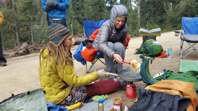 As we walked up a paved driveway toward the trailhead on the other side of the road, we heard the sound of an engine, and turned to look behind us. It was Wilfire! Yay!! She went on ahead and parked her van and then came loping down the road to greet us. A massive hugging session ensued and it was such a wonderful feeling to be so far North with her, and she gives the best hugs. Since I didn’t get to hike the last 1,400 miles with her, at least I would have memories of good times shared up here. She had a whole breakfast display set up in the back of her van for all the hikers passing through. She had also been up there the previous weekend and fed a lot of grateful hikers in the rain. This was a really perfect place to have trail magic, especially in the current conditions. We sat in the dirt parking lot and made hot beverages and pancakes to which I added almond butter, bananas and maple syrup. Several other hikers gathered there, including Mayor and his awesome little dog Katana, and his hiking companion Blaze, among several others. It was a great feeling of comraderie, there’s nothing like a group of fellow thru-hikers bonding over simultaneous misery and bliss (and food). We collectively helped finish all the goodies Wildfire had brought, and soon Crush and I loaded into her van for a quick trip to Winthrop to get Crush’s resupply package that was at the hostel there in town.