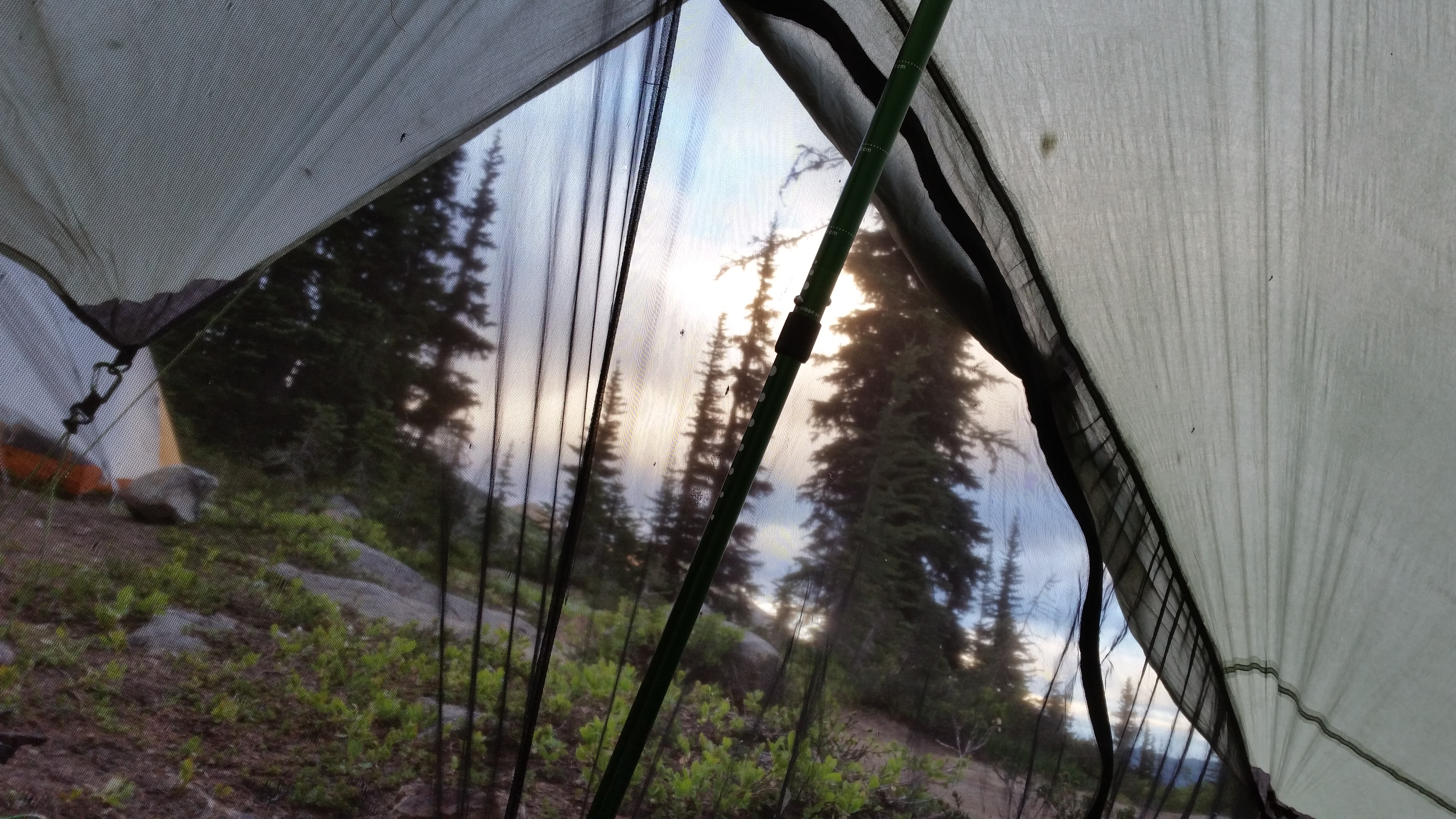 I woke up at 4:15 this morning and it was already getting light out. I almost felt like I had slept enough, and was excited about getting on the trail, but knew better. We started out by 8:00am back over Rock Pass. There was some kind of fire today, evident fairly strongly as we came over the Pass, as I even needed to keep my neck buff over my face to breathe better.