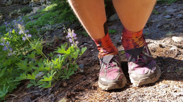 We passed through many different micro-ecosystems today as we encountered so many different kinds of terrain. I have photos of my feet on anything from scree to big rocks, to sand to snow, to mud, to flowing water on the trail, rocky traverses and exposed ridges dotted with grape scented lupine, and occasionally some actual flat dirt covered in pine duff, my favorite! We walked a solid two miles today through overgrown plant matter as high as my head, forcing me to hold my trekking poles up high to get through.