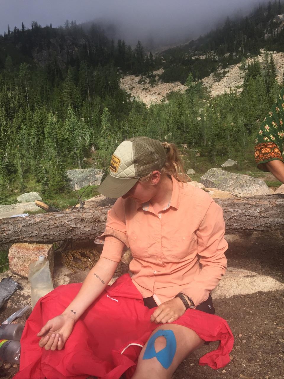 We had caught up with a couple other Sobo’s yesterday, Anna and Matthew by the end of the day. Anna was having knee trouble, so I started out the day today giving her an acupuncture treatment on the trail. The surrounding mountains were graced with clouds and mist, the way I remember Washington, and as we sat there waiting for the needles to do their magic, we chatted and shivered just a little. She had to get off trail at Rainy Pass, and so I was hoping the treatment would at least help her cover the 10 miles or so to get there. Reportedly it did.