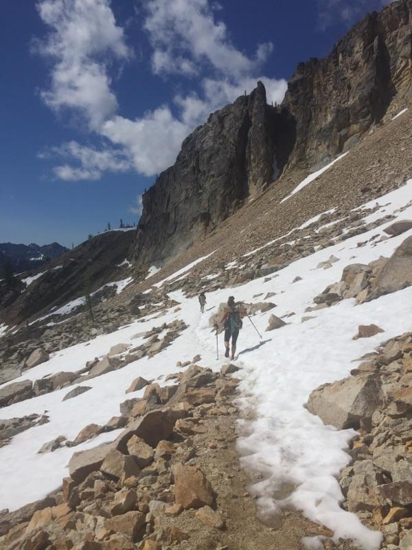 That morning we covered several large patches of snow after walking along a beautiful ridge that allowed you to walk while viewing the entire valley below blanketed in thick dark forest. It is the kind of forest that feels so pure, untouched, unobstructed by the hands of man, and expanding into everywhere. Much of the time we have to focus on every step that we place our feet. Monica calculated that we have been doing about 50,000 steps a day on her fitbit, which means that 50,000 times a day we have to pay attention to where we step. A section on trail that is flat and smoothe, therefore is like a dream, especially with the views we were getting today.