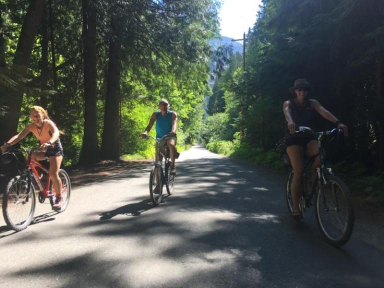 In the morning, we got our laundry done and had instant coffee in camp, with the anticipation of making it to the Bakery. We rented bikes and like little giddy children, we rode to the Bakery by 10am and delighted in real coffee, pastries and egg sandwiches. By 11am we realized we were not going to make the 11:30 bus back to the trail, so we easily agreed to extend it to the 2:30 bus. It worked out great because we then had time to relax just a little more, and I still needed to get my resupply food organized. I went digging through the hiker box and found a treasure, a fresh pair of Dirty Girl Gaiters which were perfect for Monica!
