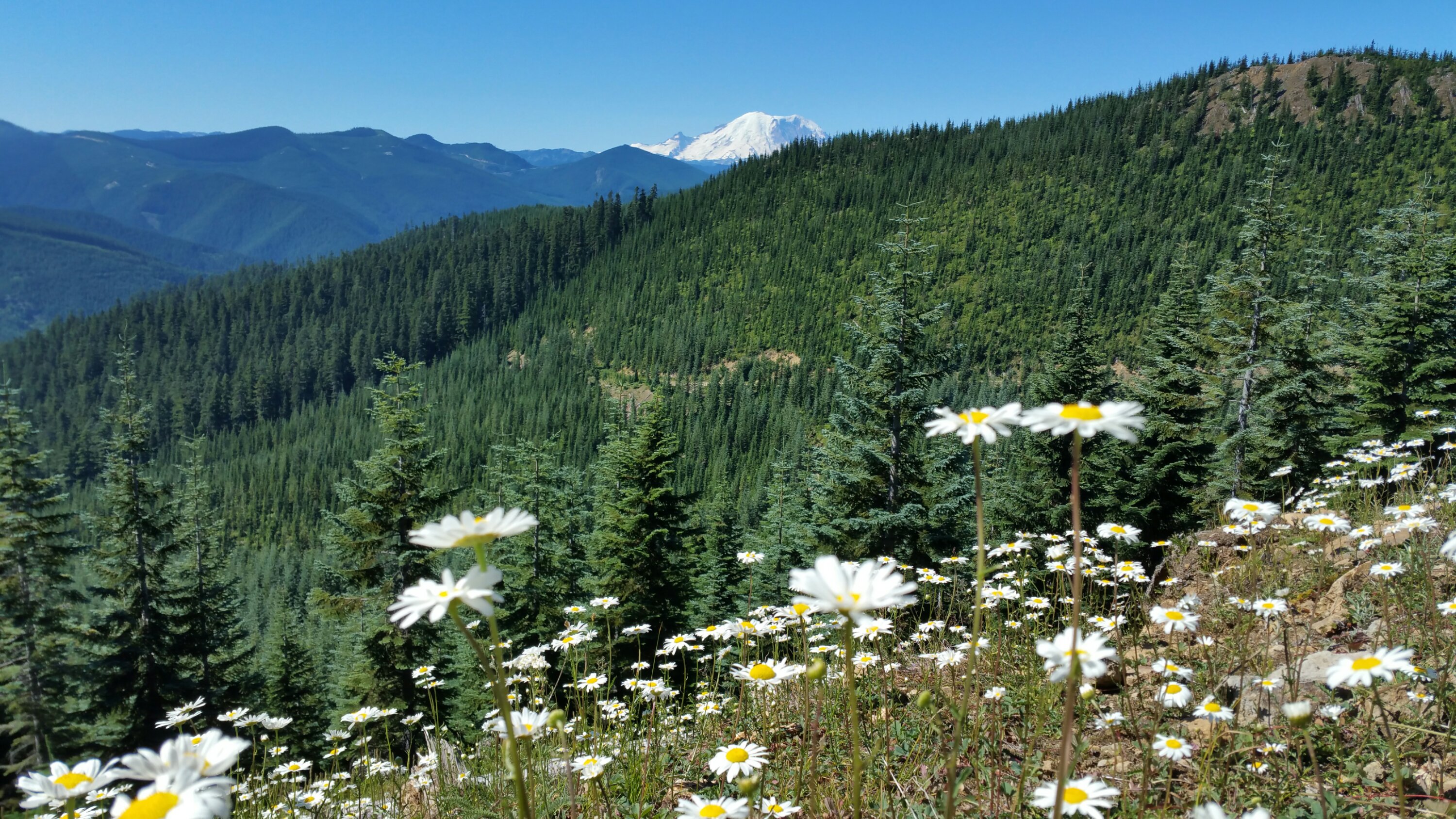 I was grateful to be hiking with someone who had hiked the PCT before, like me. I had consciously been trying to not to spoil any surprises when hiking with Monica, and also just didn’t want to be that hiker who is constantly reminiscing about “last time I hike here itwas like this…” but sometimes I could not help it. I am constantly reminded of things past, things that happened last year on the trail, that good ol’ nostalgia, but I hold back. With Carrot, I realized that we both had lots of nostalgia from the trail, so I indulged inthe nostalgia. She was hiking this section of WA for the fourth time, in fact. So, as it goes, we both were often chiming about things that happened in our previous thru-hikes, and that felt good to me. Like this spot, for instance, Crush and I git thebedt trail magic here, and we took a photo right here sitting in camp chairs…the flowers were gone then. That’s Mount Rainier looming in the distance. We will be there soon!
