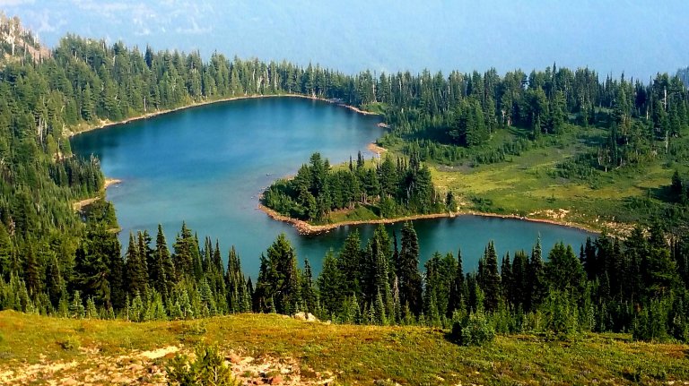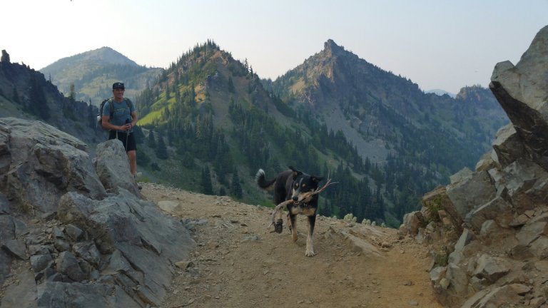As we hiked along the air became more filled with smoke and Carrot was able to get cell service and found out about a few fires, one in WA and a few in BC. We set our sights on making it to Sheep Lake by the end of the day, 26 miles, so we could swim before making camp. We ran into McGuyver and Danger Dog as we climbed the final pass of the day. Danger Dog is a blue healer and she is great. She went darting out onto some precarious talus chasing Marmots as we heaved up the pass. I turned back at all the noise of screetching Marmots and crackling talus to see the dog staggering along, looking frantically at where the furry creatures had disappeared to…..the Marmot underworld, of course.