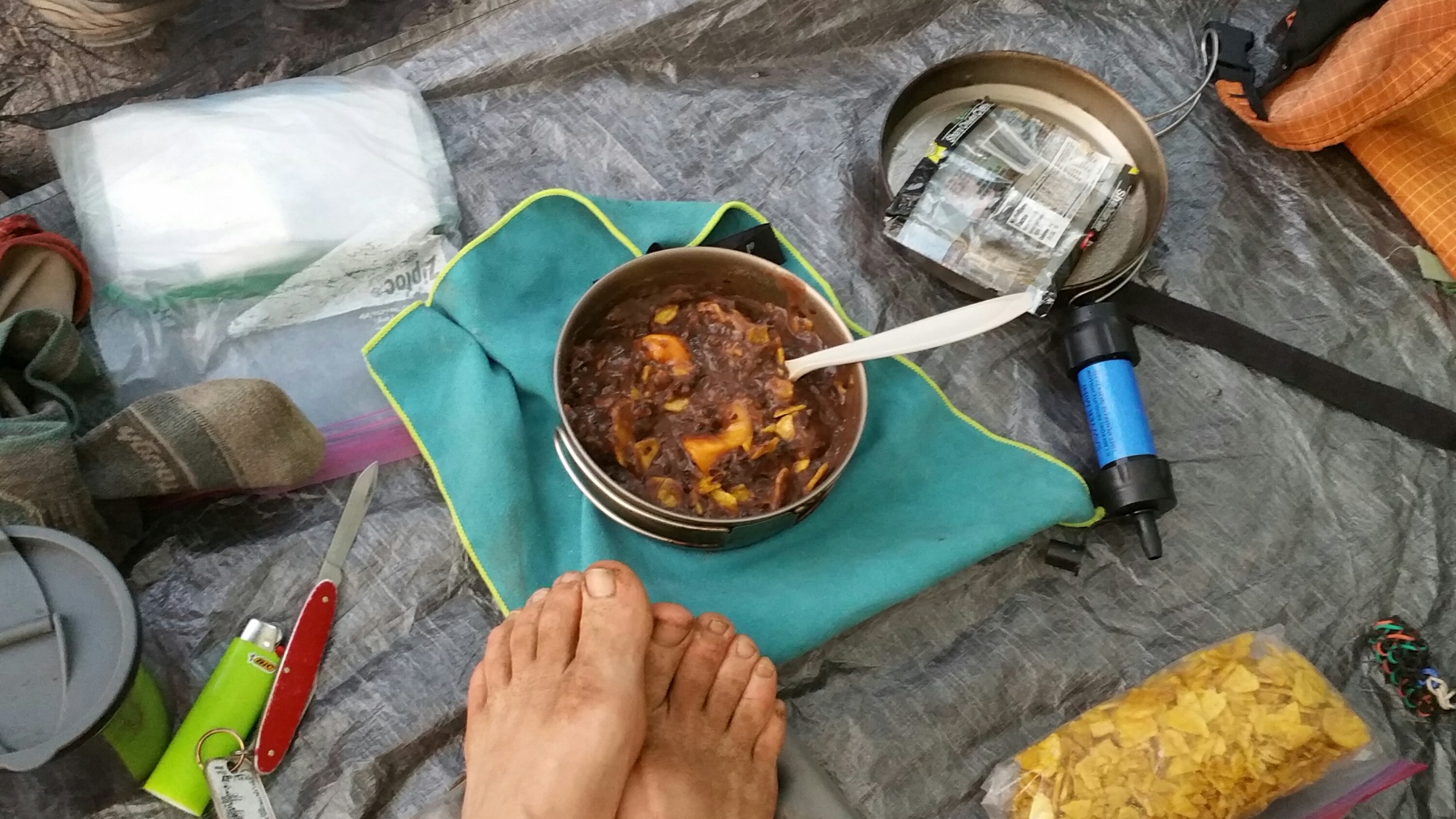 Once we reached the top of the pass we could see Sheep Lake just below, a mere 1,000 feet down and waiting for us to jump in. Sometimes I think I hike faster than Carrot, but I am wrong, she is such a strong hiker. When she decides she is ready, she charges. When I think about it, she kept saying how she is so slow and not in hiking shape right now, and yet, we were hiking the same miles every day. I feel strong, I am hiking strong, and I am just keeping up with her. She flew down that hill and by the time I made it to the lake, she was already swimming. I wasted no time and jumped in, and I tell you that swim was orgasmic, if a swim can be that. It was one of the most well deserved and satisfying swims I have had in a long time, probably sice the swim I took in the Mediterranean when I completed the GR5 in France in ’15. Yes, that great. I washed the sweat and dirt off my body and I shivered from the cold. My body temperature dropped fast and as I got out of the water I was chilled and had goose bumps from head to toe. We found a cozy little circle of trees to set up camp and I started cooking my dinner as I put on all my dry and warm cothes and sat contendly as my dinner steamed into perfection.