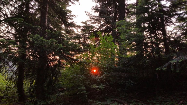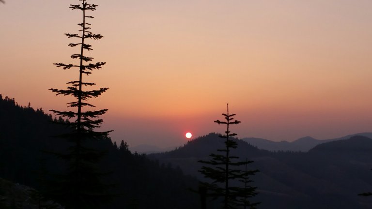 We had noticed smoke infiltrating the skies yesterday, creating a haze in the atmosphere. By the morning light at sunrise we could definitely see evidence of a fire. Thick smoke settled on the Eastern horizon and while witnessing the sunrise through the trees, I wondered where and how many fires there were. The sun was a big orange orb floating on top of the mountain ridges, but even as it rose higher in the sky, it seemed still quite heavy. I wondered….about the smoke… getting thicker and thicker….