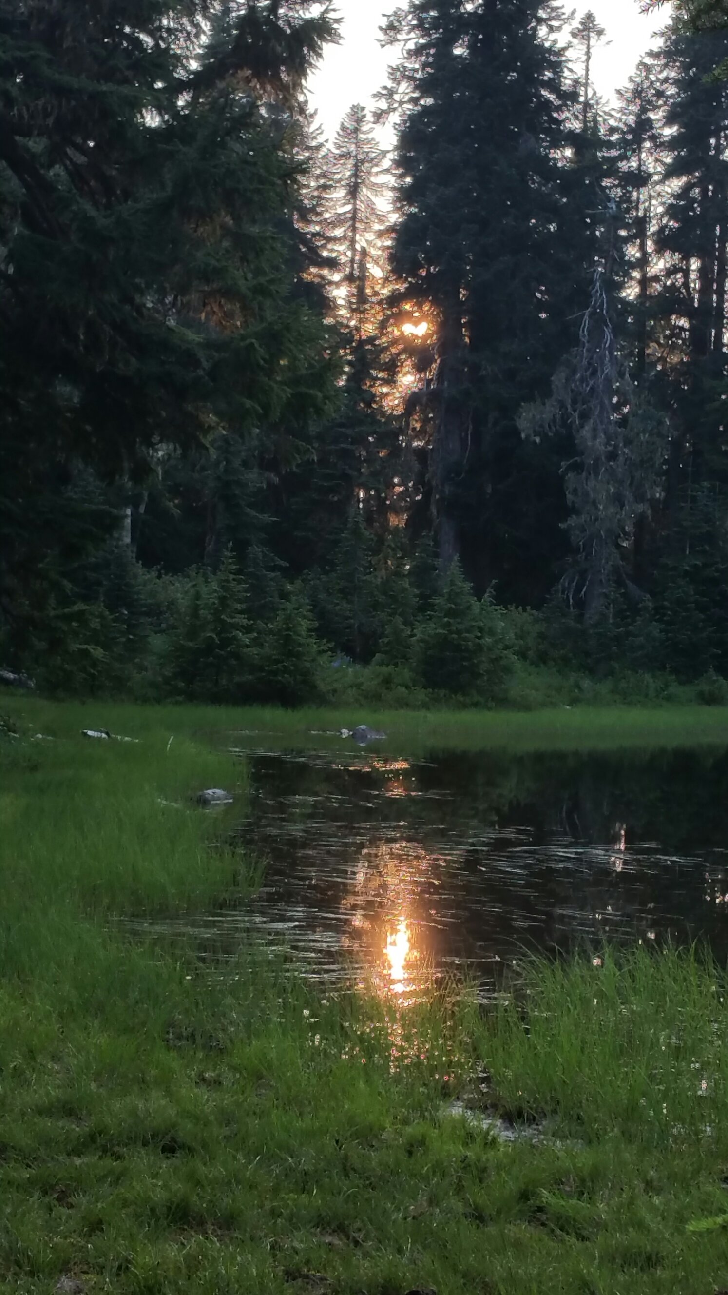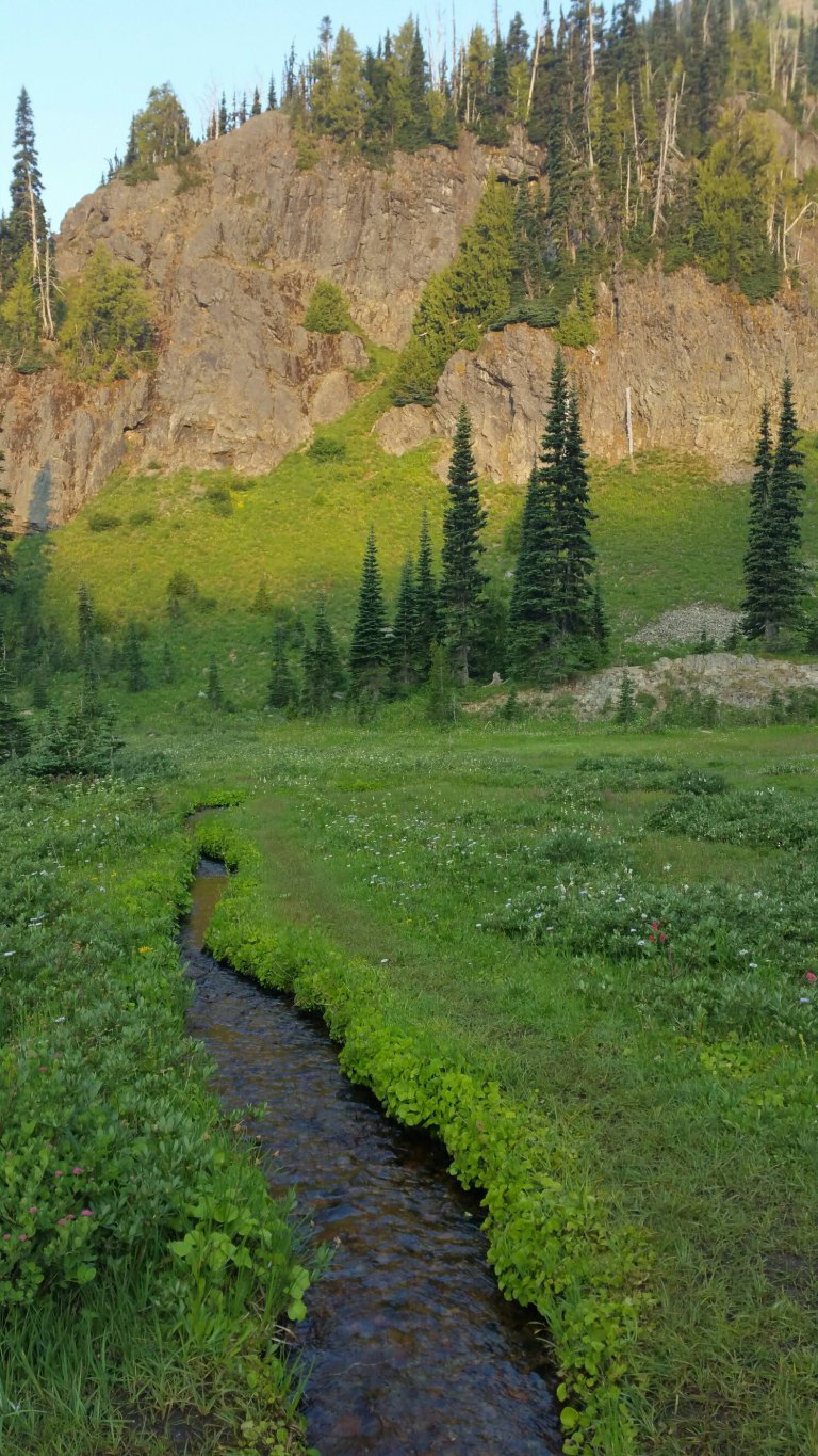 DAY 19: Journal exerpt: This morning I woke up at 6:40 and Carrot had already been up for a bit. I honestly felt like I could have gone back to sleep, but no, not such a thing in the life of the thru-hiker. She headed out on trail by 7:00 and I was slow and really just wanted to sit by the perfect little creek, meditating. This whole meadow near Sheep Lake is covered in fresh grass and wildflowers of all kinds. There are towering walls of rock around us and all night I heard the elk tromping aroud, though I have not seen any yet…