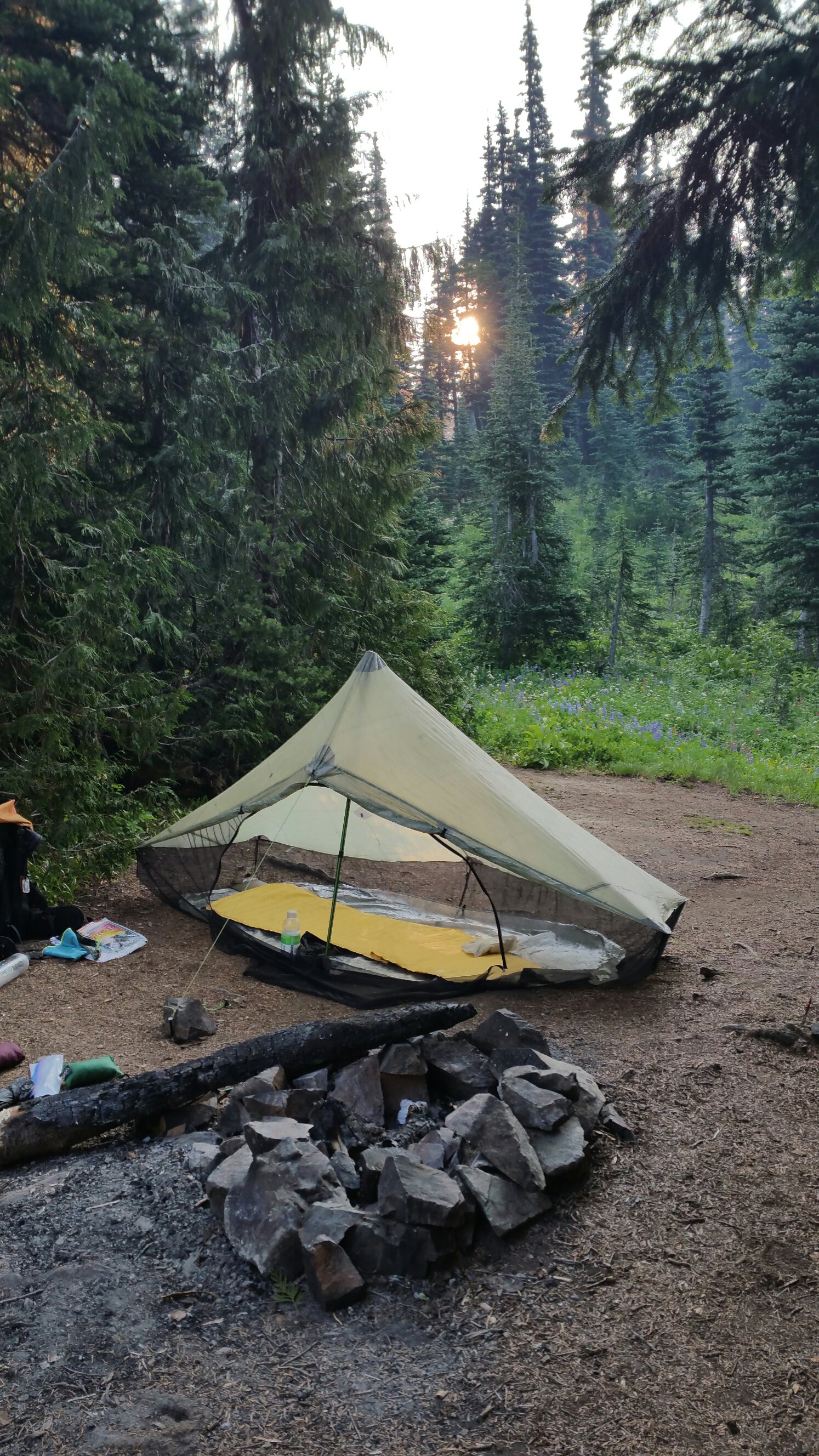 There were several other hikers already camping there so I had to ask around if there were any other places to camp. A friendly man pointed me in the direction of a little footpath through some deadfall that eventually guided me to a stealth coveted campsite, where Carrot and I ended up cowboying. It was a great night, the stars were twinkling and I slept quite well. Except for that time we awoke to loud crunching footsteps in the forest nearby, and by the time I switched on my headlamp it was gone. It’s always like that, you never see the “thing” that is making such loud noises in the night. But I wasn’t making it up, because it woke both of us up!