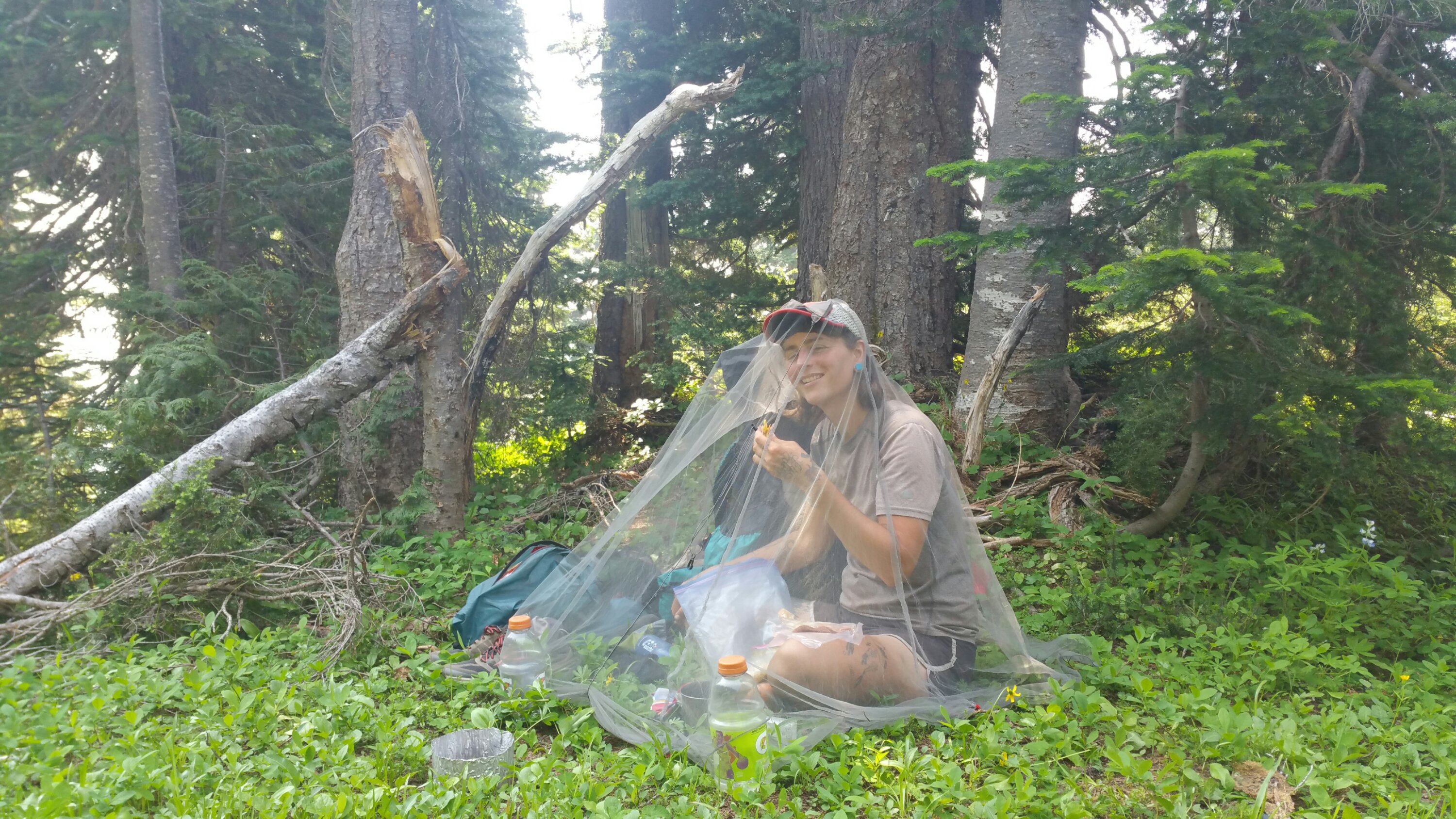 I started hiking by 7:54, late, wow! The temps rose into the 90’s today and we heard it was 104 in Packwood, the small town we planned on going into tomorrow for “real food”. This morning we crossed Chinook Pass and into the Mt. Rainier National Park zone. At one point the mountain was visible through all the haze, like a big heavy ghost. By 10:30am I had already dunked my head under three waterfalls, and thank God for those! It was getting hotter and smokier, but I still felt strong in my legs and feet. I pushed to hike faster and was able to catch up to Carrot by noon, where I found her sitting in her mosquito net tent, eating Salami folded in a taco shspe and filled with plantain chips. She told me it was so hot and buggy that she had been zombie walking and now she was eating salami and that’s precisely how she became the Salami Zombie (her “other” trail name).